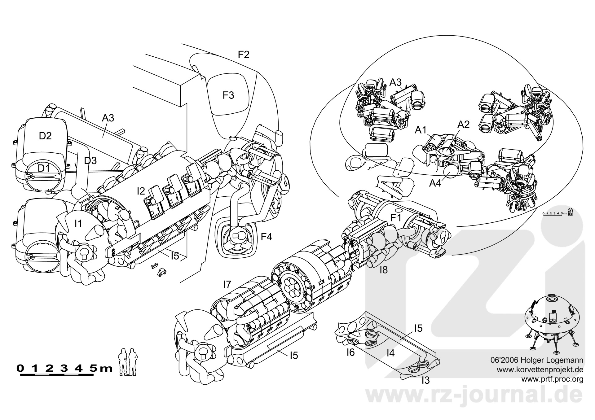 Andruckabsorber A1 Generator des abschirmenden Strukturfeldes (Inerter) A2 Projektoreinheit des Strukturfeldes (Inerter) A3 Booster (Inerter) A4 Dreivektoren-Sekundärkompensator