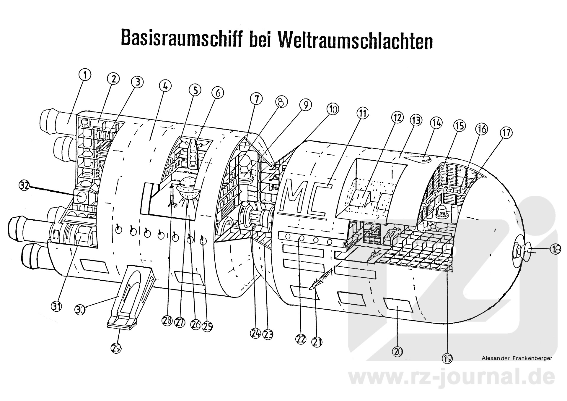 Allgemeines: Basisraumschiff bei Weltraumschiachten Schiffe dieser Art wurden bei lang anhaltenden Raumschlachten zur besseren Koordination der Flottenverbände eingesetzt. Zur Erfüllung ihrer Aufgabe wurden sie mit riesenhaften Positronengehirnen ausgestattet; bei Gefechten, die länger als 5 Wochen dauerten, übernahmen sie das Kommando über max. 30 000 Einheiten der solaren Flotte. Sie berechneten die günstigsten Angriffsformationen. Im Notfall konnten diese Schiffe sogar kurzzeitig die Schlachtschiffe direkt, d. h. unter Umgehung der Befehlsgewalt der Schiffskommandanten, steuern. Die Basisraumschiffe operierten vorwiegend hinter der Front; ihre Bewaffnung war im Verhältnis zu ihrer Größe eher als schwach zu bezeichnen. Die ersten Schiffe-dieser Art gingen im Jahr 2168 ir Serie. Im Jahr 2295 jedoch galten sie bereits wieder als veraltet, und sie wurden eingemottet. Die Einzelkämpfertaktik, bei der jeder Kommandant eigenständige Befehle geben kann, erwies sich als erfolgreicher. Techn. Daten: Länge: 3800 Meter Durchmesser: 800 Meter Beschleunigung: 350 m/sec² Besatzung: 1500 Mann |