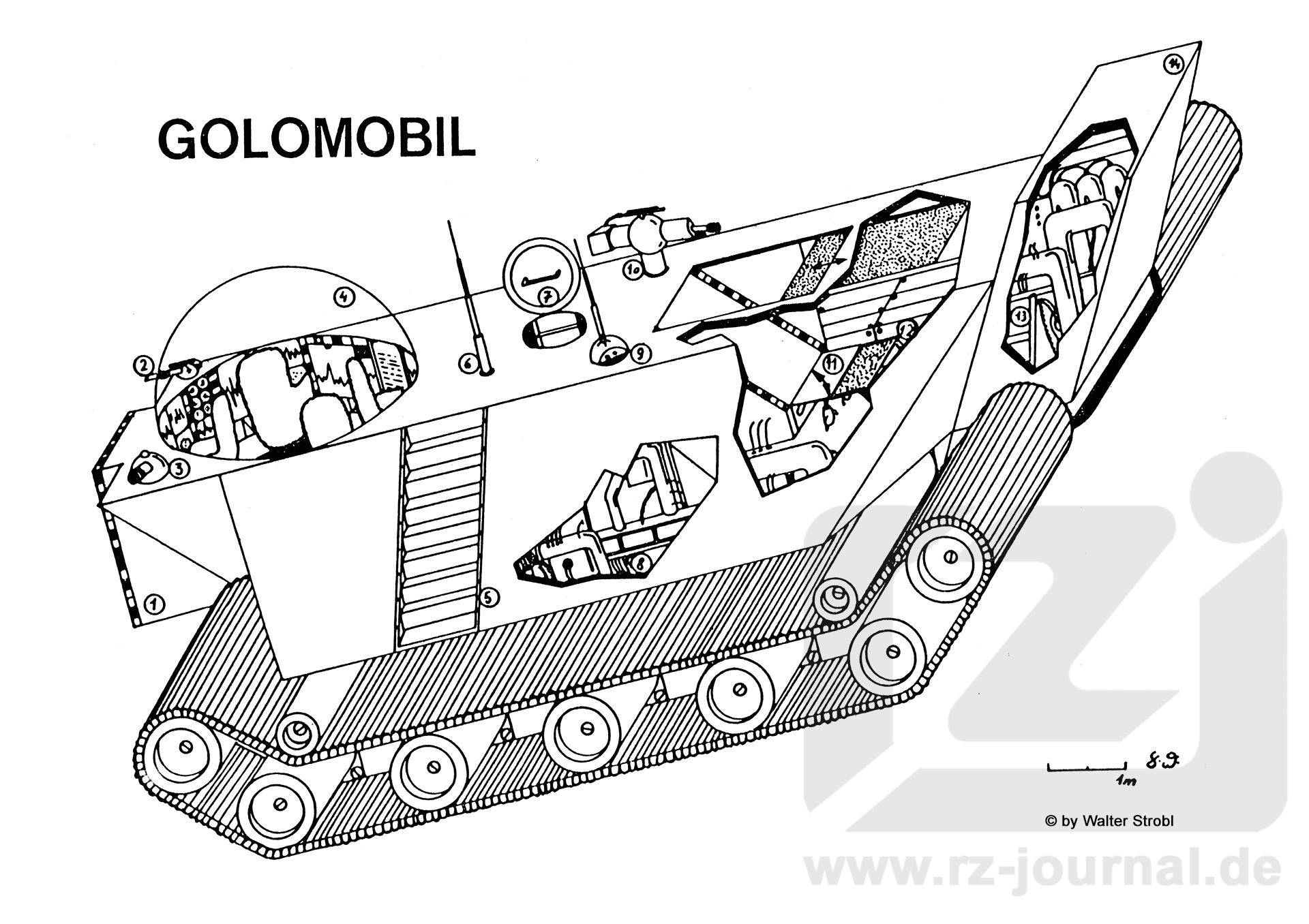 Allgemeines: Das Golomobil Ist ein Fahrzeug für Landausfluge auf Gol, dem 14. Planeten der Wega Auf diesem Planet, einem Ammoniak-Methan-Riesen von 434 000 Kilometer Durchmesser herrscht eine Oberflächengravitation von 916g und eine Temperatur von minus 163 Grad Celsius. Da es wegen der hohen Schwerkraft unmöglich war, das Golomobil auf Gleiterbasis zu bauen, stellte man ein Raupenfahrzeug her. Das Chassis wurde aus einer Robotarbeitsmaschine ausgebaut.