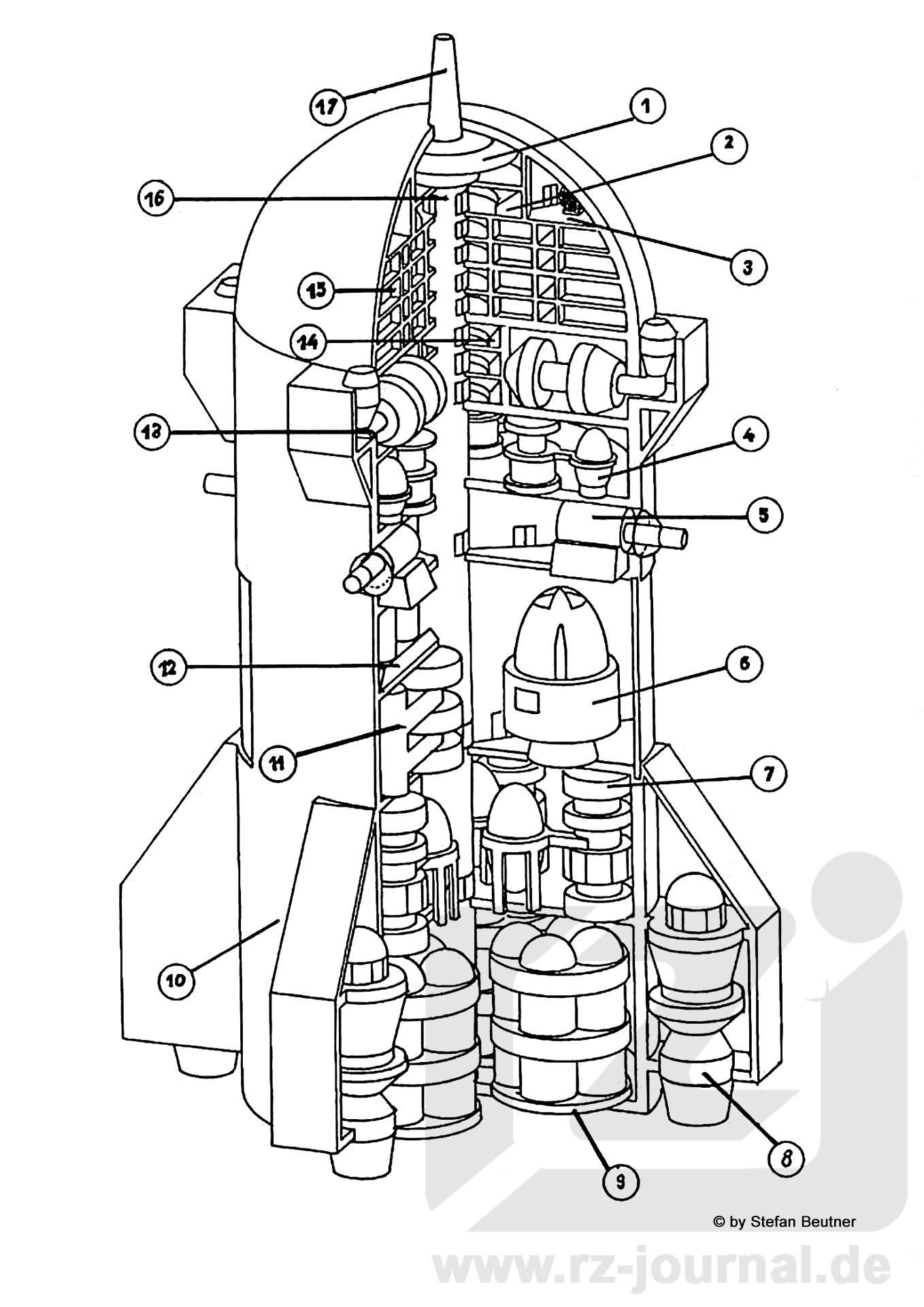 Technische Daten: Länge ohne Antenne: 112,5 m Durchmesser ohne Triebwerksgondeln: 45 m Besatzung: 60 Mann (im Notfall können es bis zu 300 Mann sein) Beschleunigung: 720 km/sek² Reichweite: 1 2 Millionen Lichtjahre |