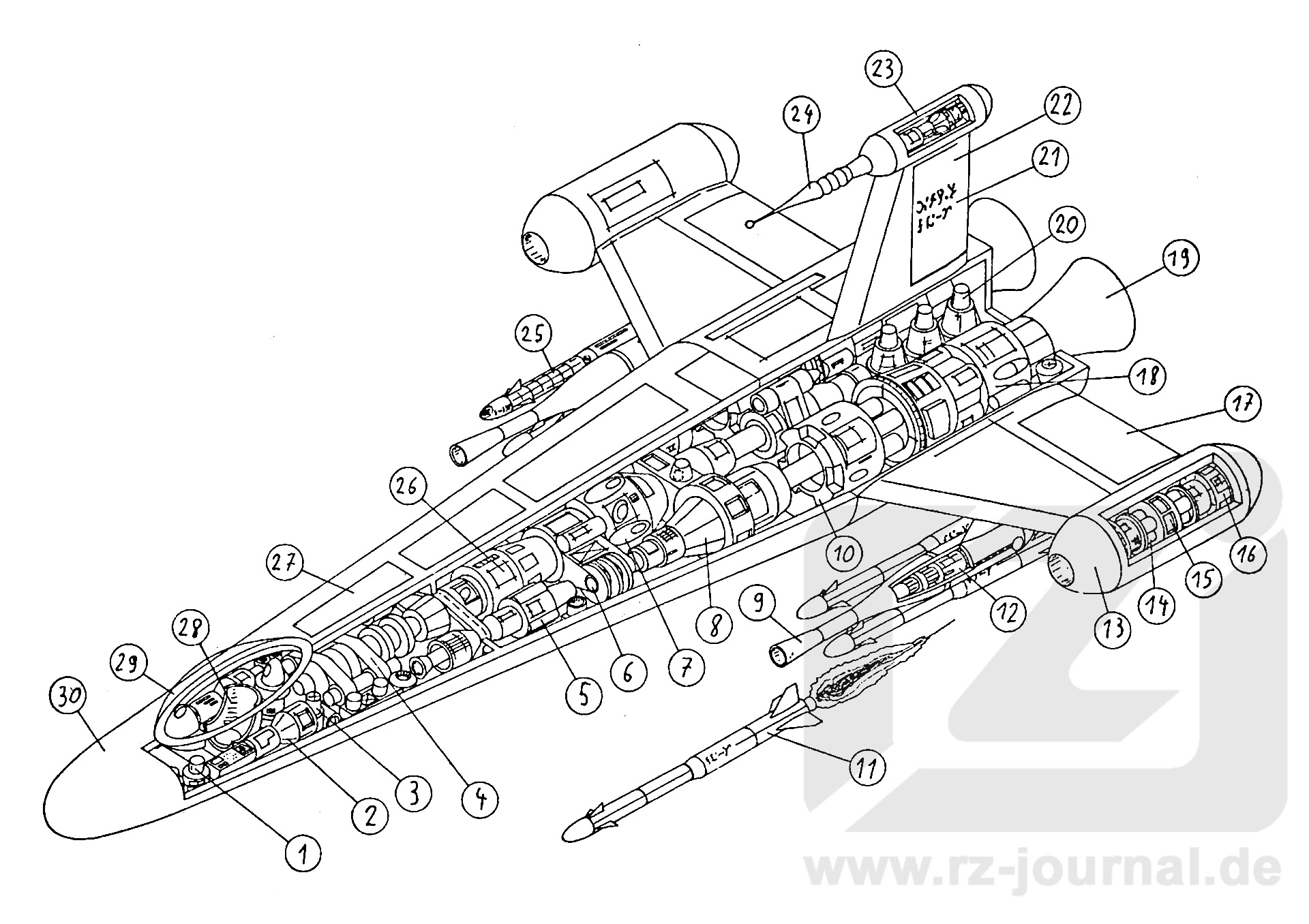 Technische Daten: Länge ca. 24 m, Flügelspannweite ca. 14 m, Besatzung 1 Mann, Beschleunigung: 870 km/sec², Reichweite 14 000 Lichtjahre. |