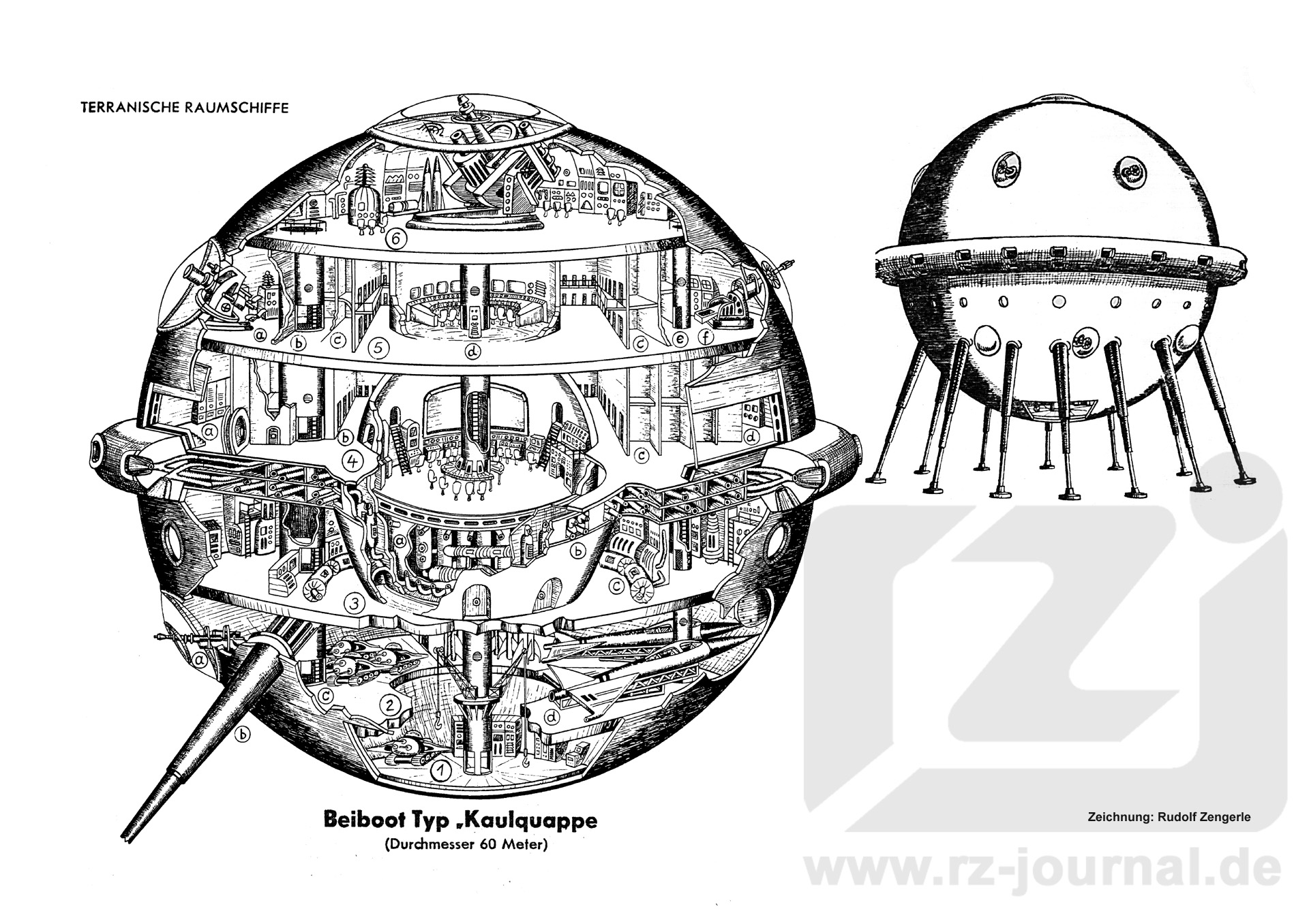 Schweres Polgeschütz mit Positrtonik und Kraftanlage Feuerleitzentrale, a) Observatorium, b) Anti- gravschacht für Lasten, c) Mannschaftsräume, d) Anti- gravschacht von Pol zu Pol, e) Antigrav- schacht, f) Geschütz Hauptzentrale mit Panoramabildschirm, Steueranlage und Positronik, a) Nebenschleuse, b) Funkzentrale, c) Mannschaftsräume, wissenschaftliche Abteilung und Krankenstation d) Hauptschleuse Maschinenraum und Kraftanlage, a) Lineartriebwerk, genannt "Kalup" , b) Impulstriebwerk und Äquator-Ringwulst mit 18 Feldprojektoren, c) Antigravprojektoren Laderaum und Hangar, a) Geschütz, b) Teleskoplandestützen (insges. 12 Stück), c) Shifts (Flugpanzer), d) 3-Mann-Zerstörer Verladeraum mit Bodenschleusen |