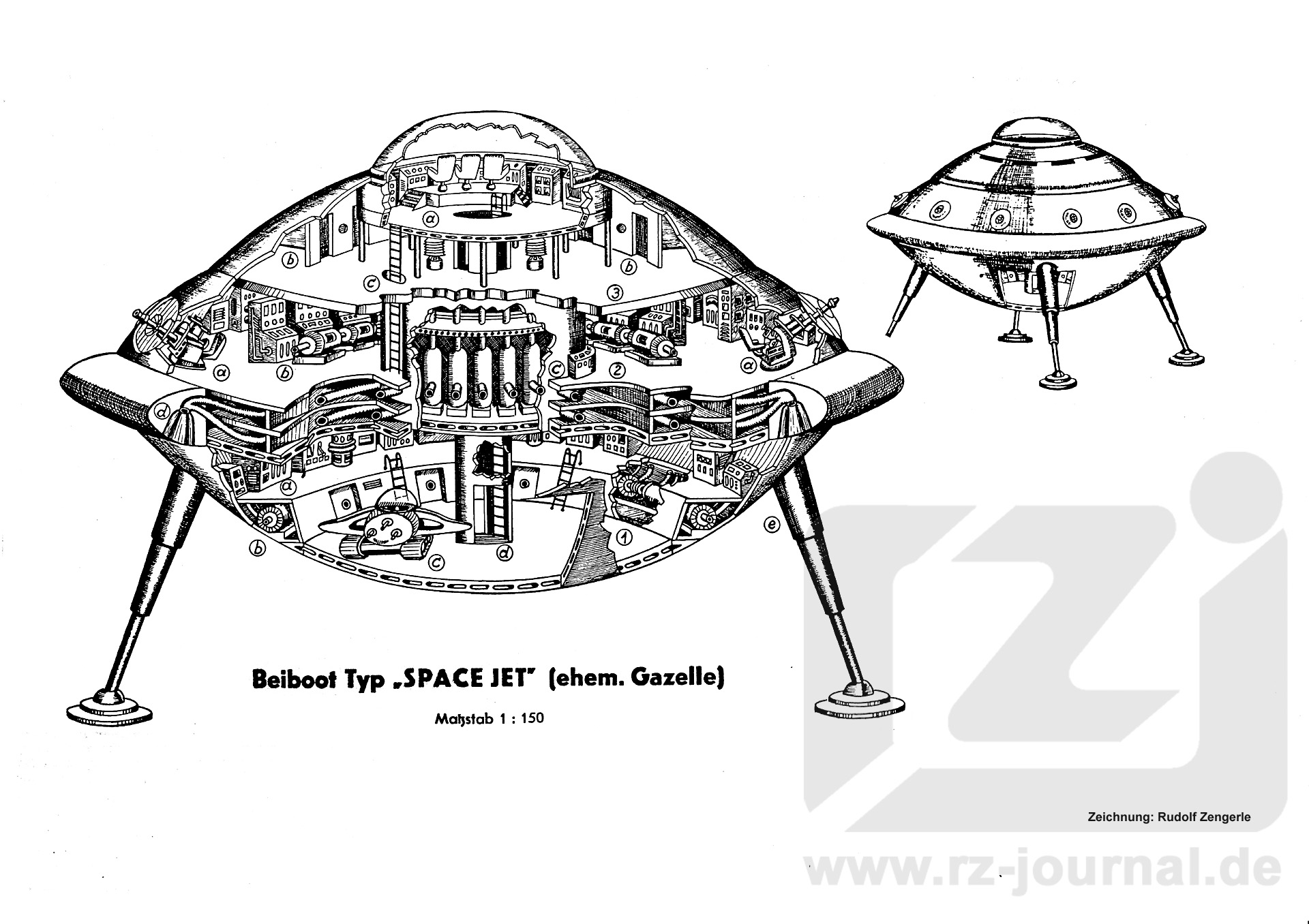 Allgemeines: Aufklärer und Angriffsfahrzeug. ellipsenförmig. 30 Meter Durchmesser, 18 Meter Höhe, überlichtschnell, 4 Mann Mindestbesatzung erforderlich |