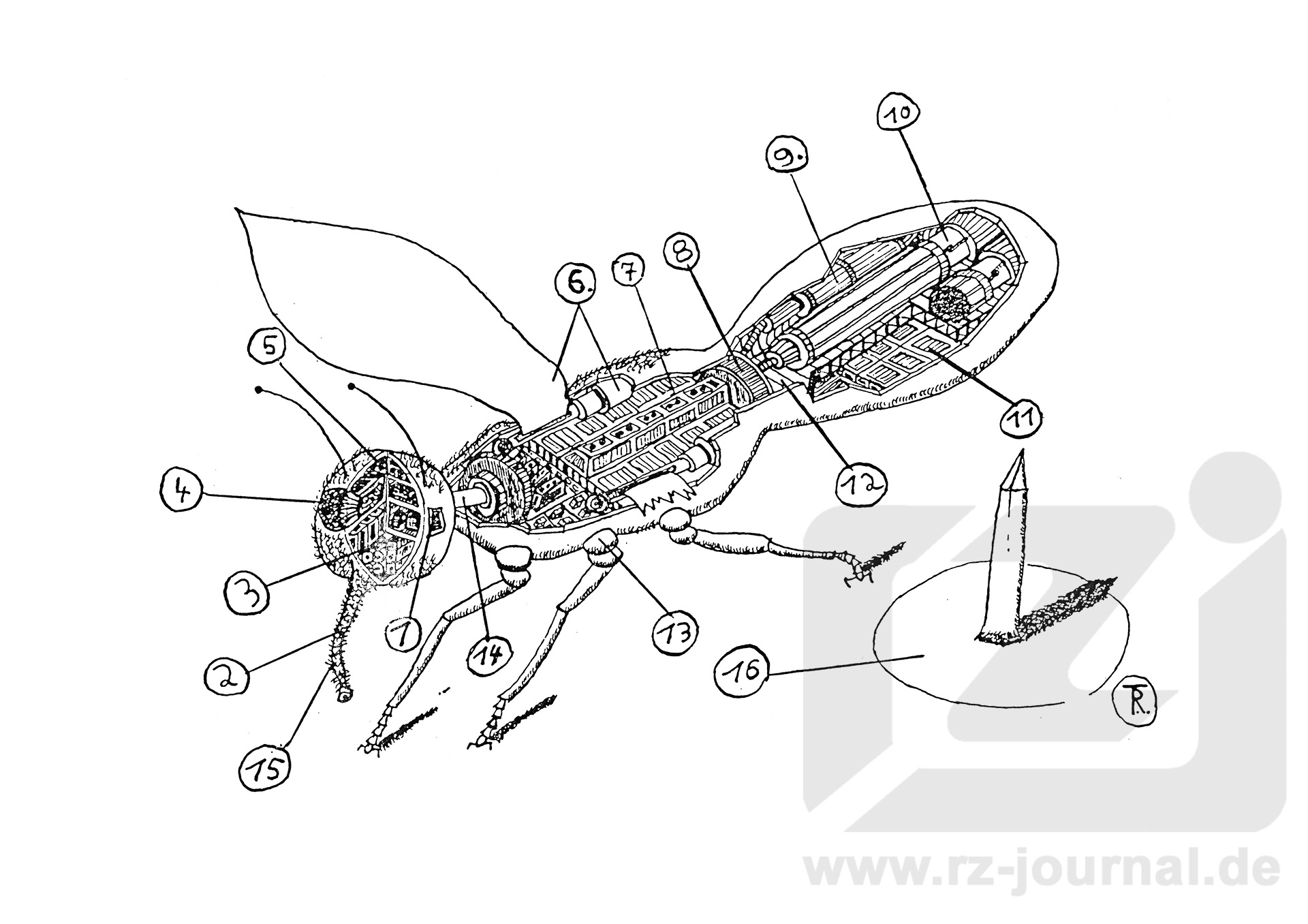 Allgemeines: Diese als Insekt getarnte Mikrosonde wurde von den Swoon entwickelt. Ihre geringe Größe und ihre Tarnung sind für Spionagearbeiten von großer Bedeutung. So wurde sie zum Beispiel bei der Suche nach Perry Rhodan, der im Jahre 2328 von Iratio Hondro entführt worden war, benötigt. Die Sonde wird aus einer Spezialabschussvorrichtung geschossen und ist schon bei hundert Meter Entfernung unsichtbar. Technische Daten: Standhöhe ca. 2 cm; Länge ca. 4 cm; Reichweite ca. 10 000 km; max. Geschwindigkeit 1000 km/h in erdähnlicher Atmosphäre; ungeeignet für den Weltraum |