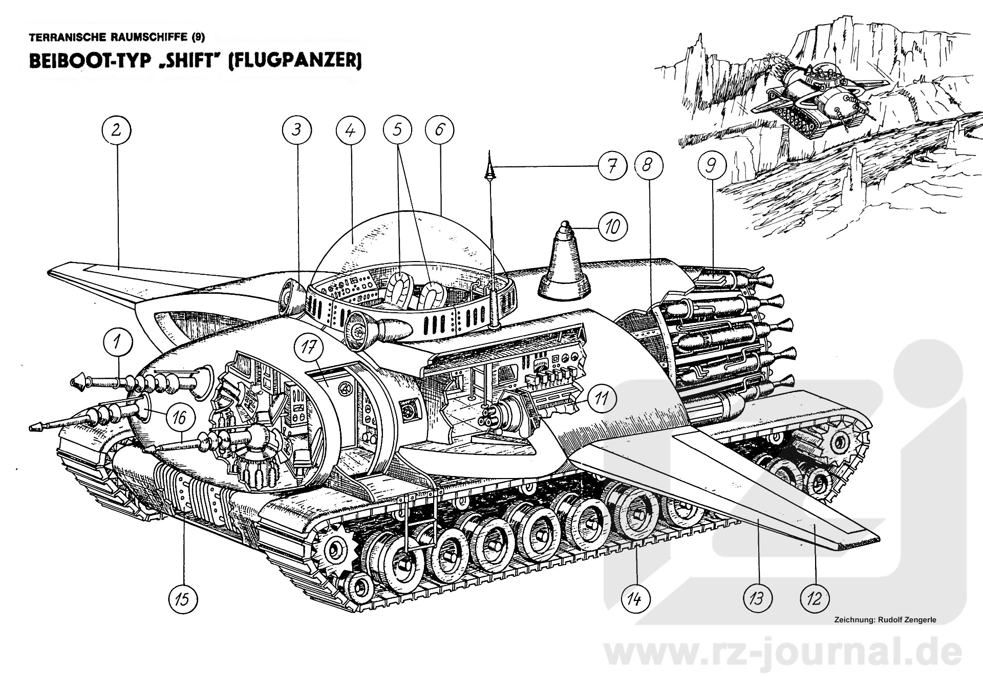 Allgemeines: Die Zeichnung zeigt das ältere Modell. Der Shift ist ein Allzweckpanzer für Flug im Weltraum und in planetarischer Atmosphäre. Gleichzeitig kann er sich zu Lande und über und- unter Wasser bewegen. Er ist zehn Meter lang und vier Meter breit. Besatzung: Sechs Mann. An Bord befinden sich Spezialwerkzeuge und Lebensmittelvorräte. Dieses Beiboot eignet sich vor allem bei Einsätzen auf lebensfeindlichen Welten. |