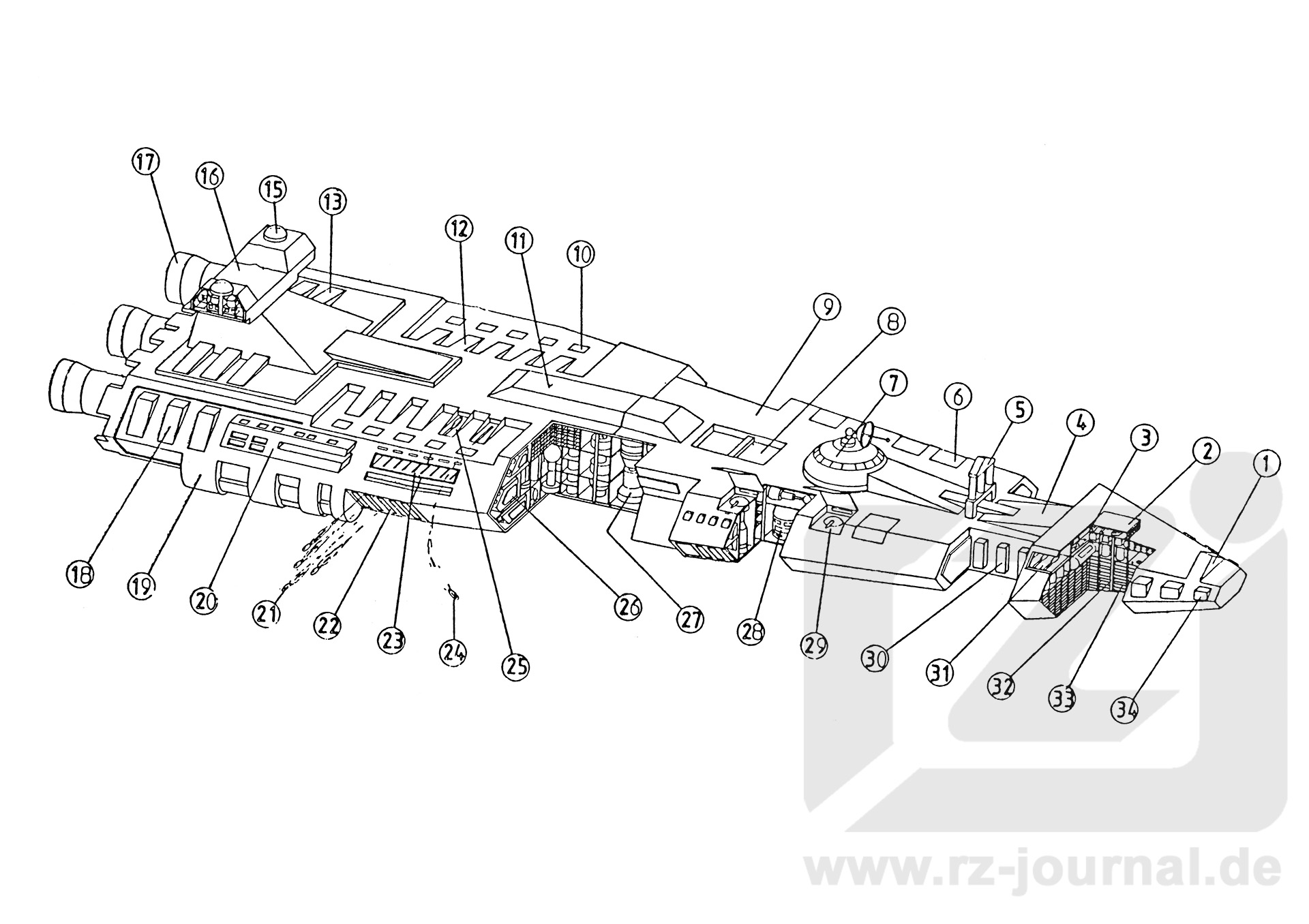 Allgemeines: Dieses Raumschiff wurde als Erkundungsschiff in ferne Galaxien geschickt. Es war 1800 m lang, max. 800 m breit und 120 m hoch. Es hatte 1200 Mann Besatzung und eine Reichweite von 20 Mio. Lj. |