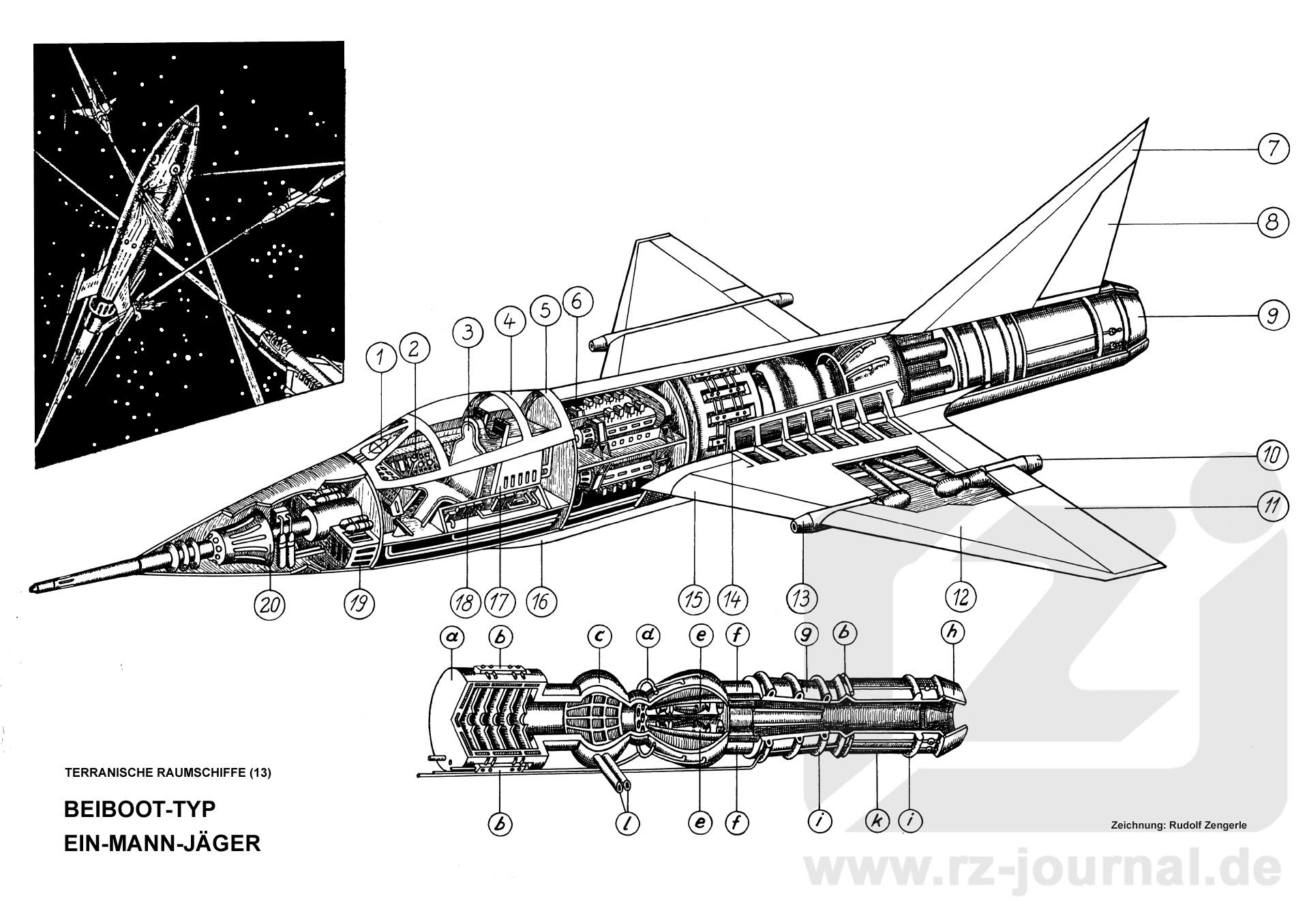 Allgemeines: Torpedoförmige Kampf- und Angriffsrakete für Flug im Weltraum und in planetarischer Atmosphäre. Ein Mann Besatzung. Fünfzehn Meter lang. Erreicht in zehn Minuten Lichtgeschwindigkeit. |
