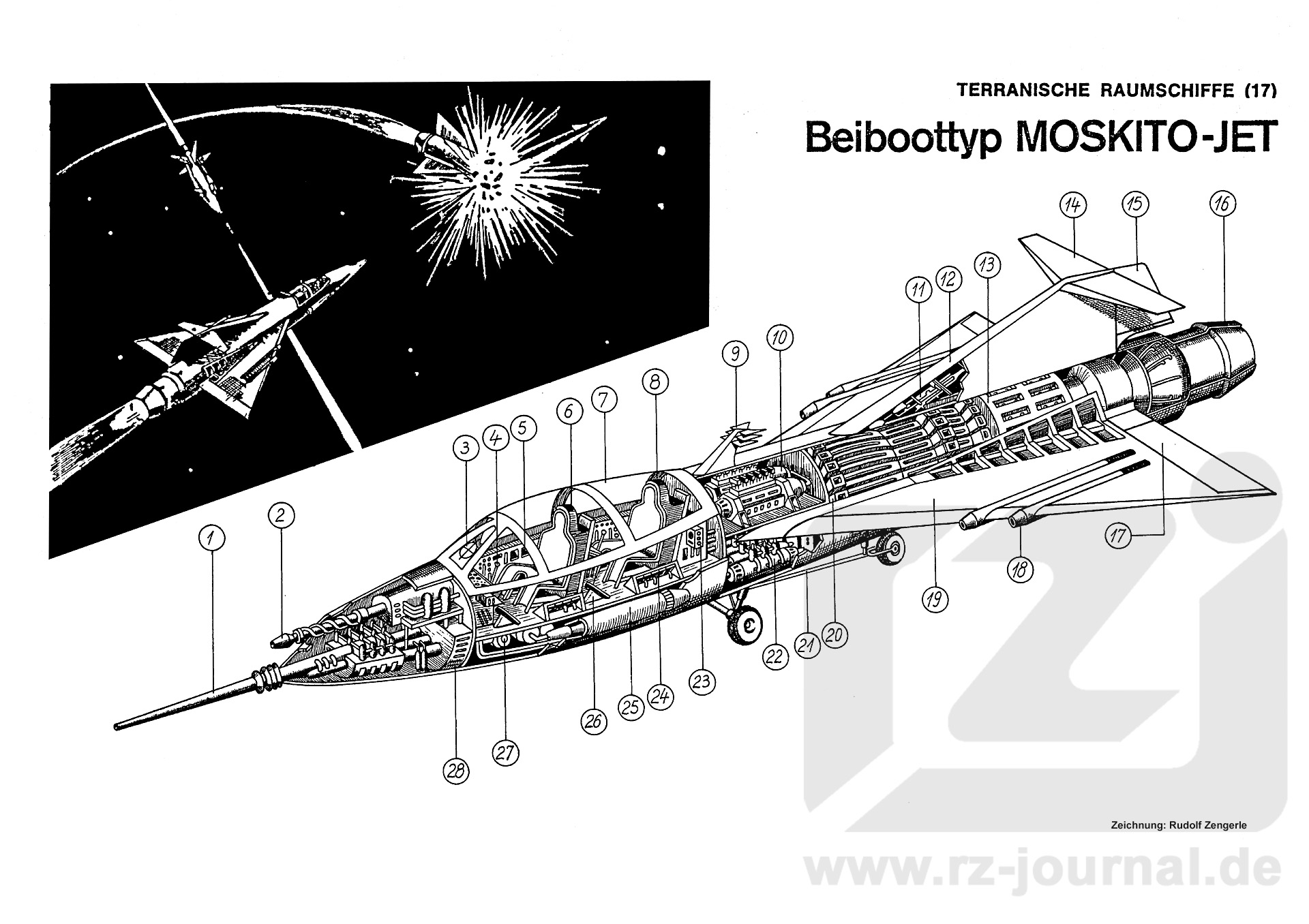 Allgemeines: Torpedoförmiger Angriffsraumjäger, sechsundzwanzig Meter lang. Zwei Mann Besatzung. Für Flug in planetarischer Atmosphäre, Weltraum und linearem Zwischenraum geeignet. Die neueren Modelle werden Lightning-Jäger genannt und besitzen ein Beschleunigungsvermögen von 850 km/sec2. Sie besitzen eine starr im Bug eingebaute Transformkanone und einen Waring-Mikrokompensationskonverter der ihnen eine Reichweite von 300000 Lichtjahren verleiht. |