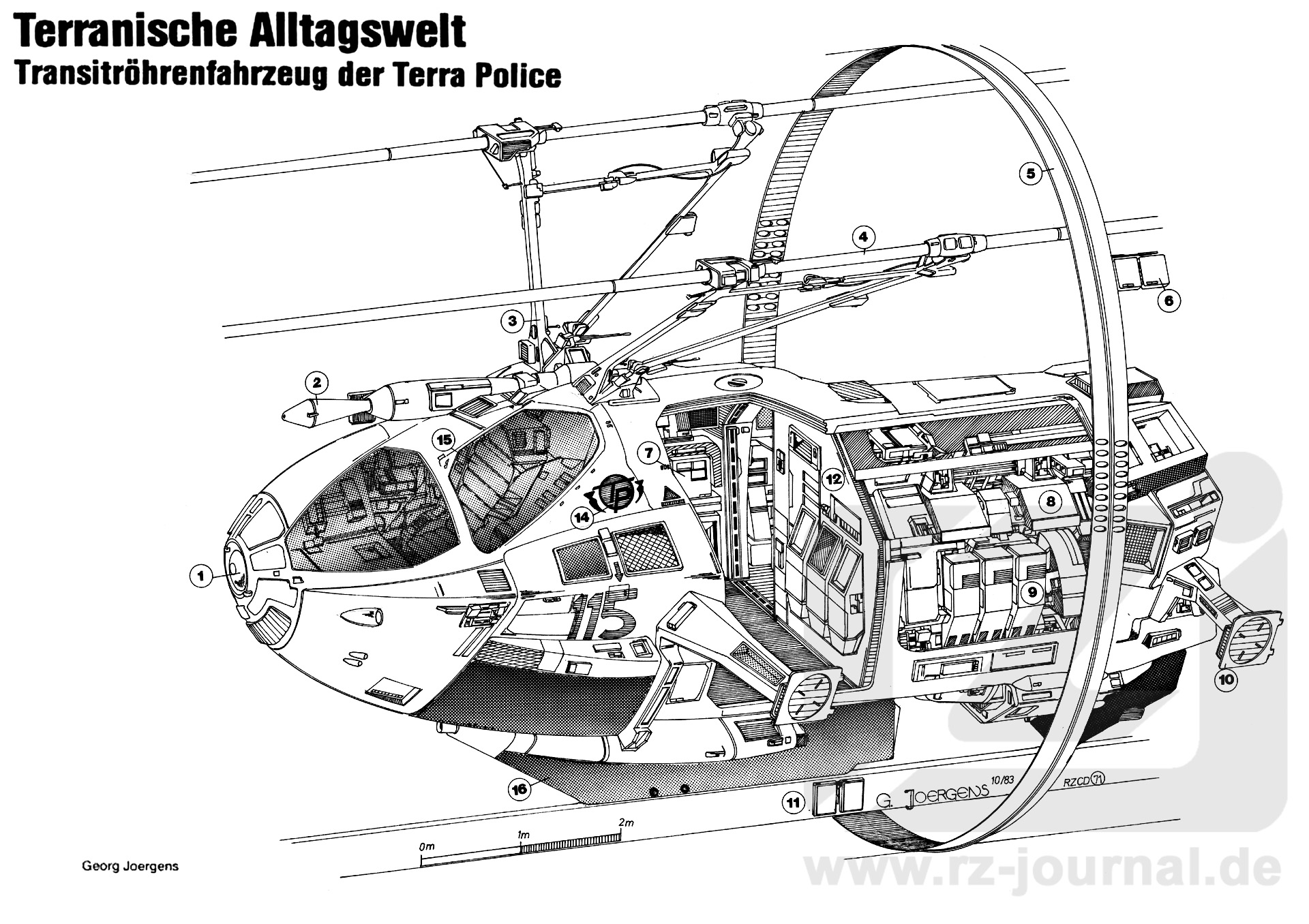 Das Verkehrsnetz Terras besteht rocht nur aus Luft- und Wasserstraßen, sondern umfaßt auch die Personen- und Transitröhrensysteme der Großstädte. Während die Personenröhren mit Rollbändern ausgestattet sind, sind die Transitröhren nur für Fahrzeuge geeignet, da sie zwecks schnellerer Fortbewegungsmöglichkeit luftleer sind. Dadurch entstehen keine Reibungskräfte. und die Fahrzeuge können um ein Vielfaches schneller fahren Das gezeigte Transitröhrenfahrzeug ist eines der typischen Röhrenfahrzeuge, wie sie auch für den Privatgebrauch gebaut werden Zusätzlich ist es Jedoch mit einem Traktorstrahler und einer Paralysatorkanone ausgerüstet, wie sie nur den Ordnungskräften der Terra Police zustehen.