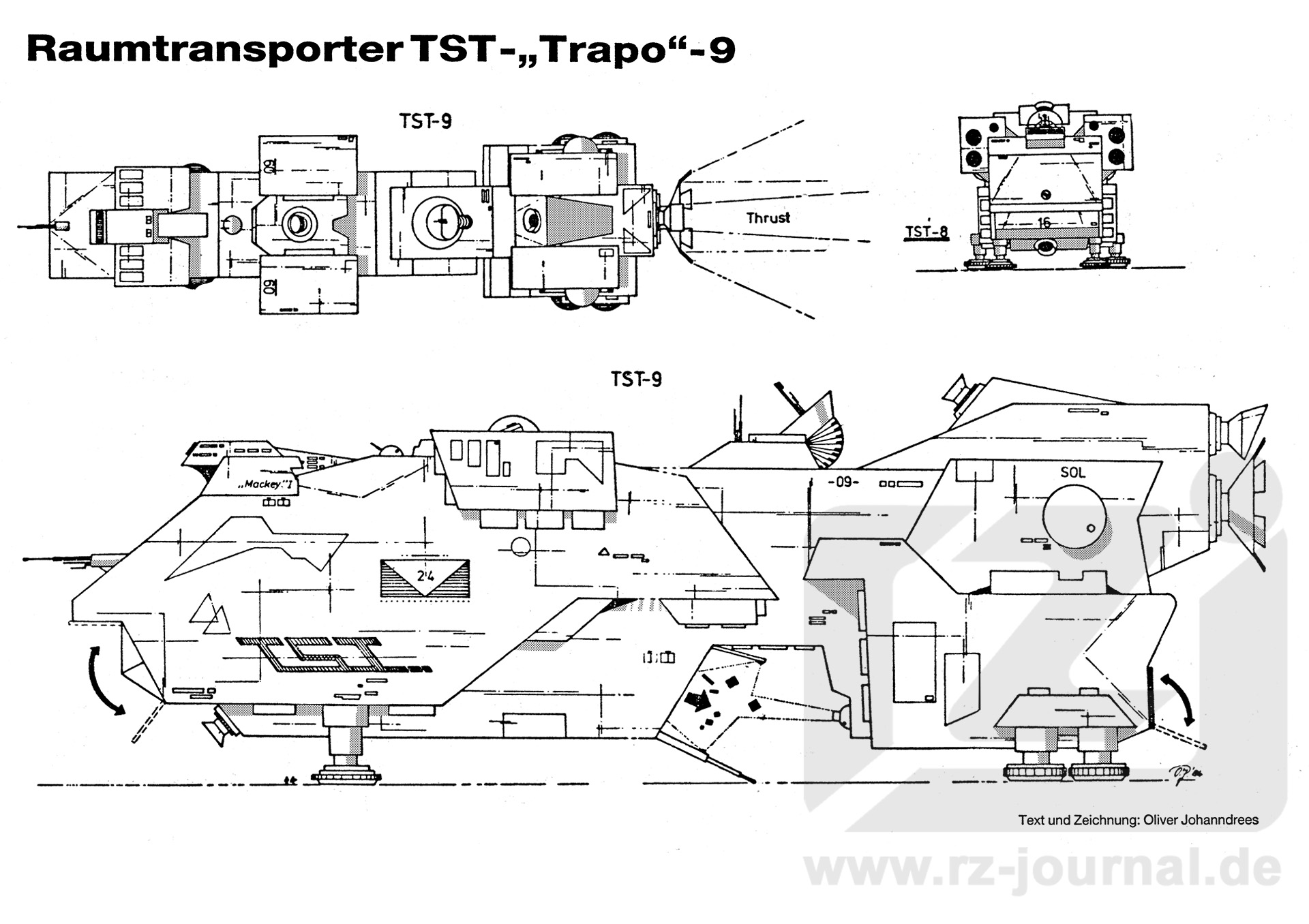 Technische Daten: Länge: 295 Meter Breite: 53 Meter Höhe: 95 Meter Beschleunigung: 788 km/sec². Besatzung: 28 Mann Ruhende Masse: 3,99 Millionen Tonnen mit max. Ladung 1 Million Tonnen Leergewicht Bewaffnung: Ein Doppel-Transformgeschütz (bis 1500 Gigatonnen) Trägerkapazität für bewegliche Einheiten: 2 Stück 30-Meter-Space-Jets Def.-Bewaffnung: Doppelt gestaffelter HÜ-Schirm, Deflektorschirm 12. der TST-9-Schiffe wurden umgebaut, um wissenschaftlichen Zwecken zu dienen. Weitere 500 Exemplare wurden nochmals verbessert, auf den Bedarf der neuen Besitzer zurechtgestutzt und den Halutern übersandt, die sich noch heute an den alten Kisten erfreuen. Von den so insgesamt jemals gebauten 1918 Schiffen gingen 14 Schiffe durch Reibereien zu Bruch, weitere 32 wurde frühzeitig, d. h. nach 123 Jahren stillgelegt. Heute fliegt in der terranischen Flotte kein einziges Schiff mehr... |