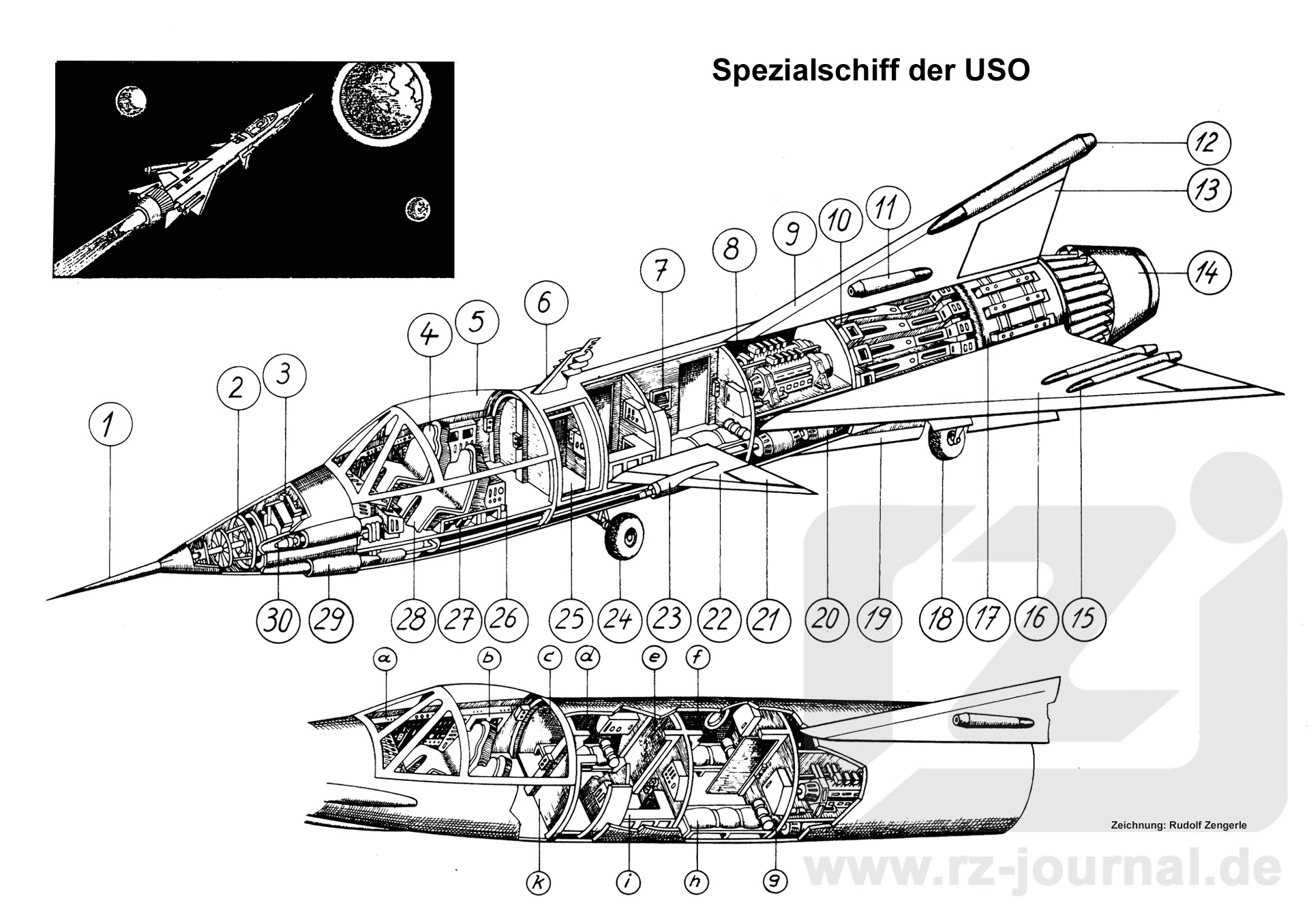 a Armaturen und Instrumentenbrett b Relief- und Echoschirme für Massen- und Energieortung c Schott zu den Kabinen d, f, g Kabinen e Verbindungsschott h Pneumatische Liege i Automatküche k Zentraleschott zur Schleuse |