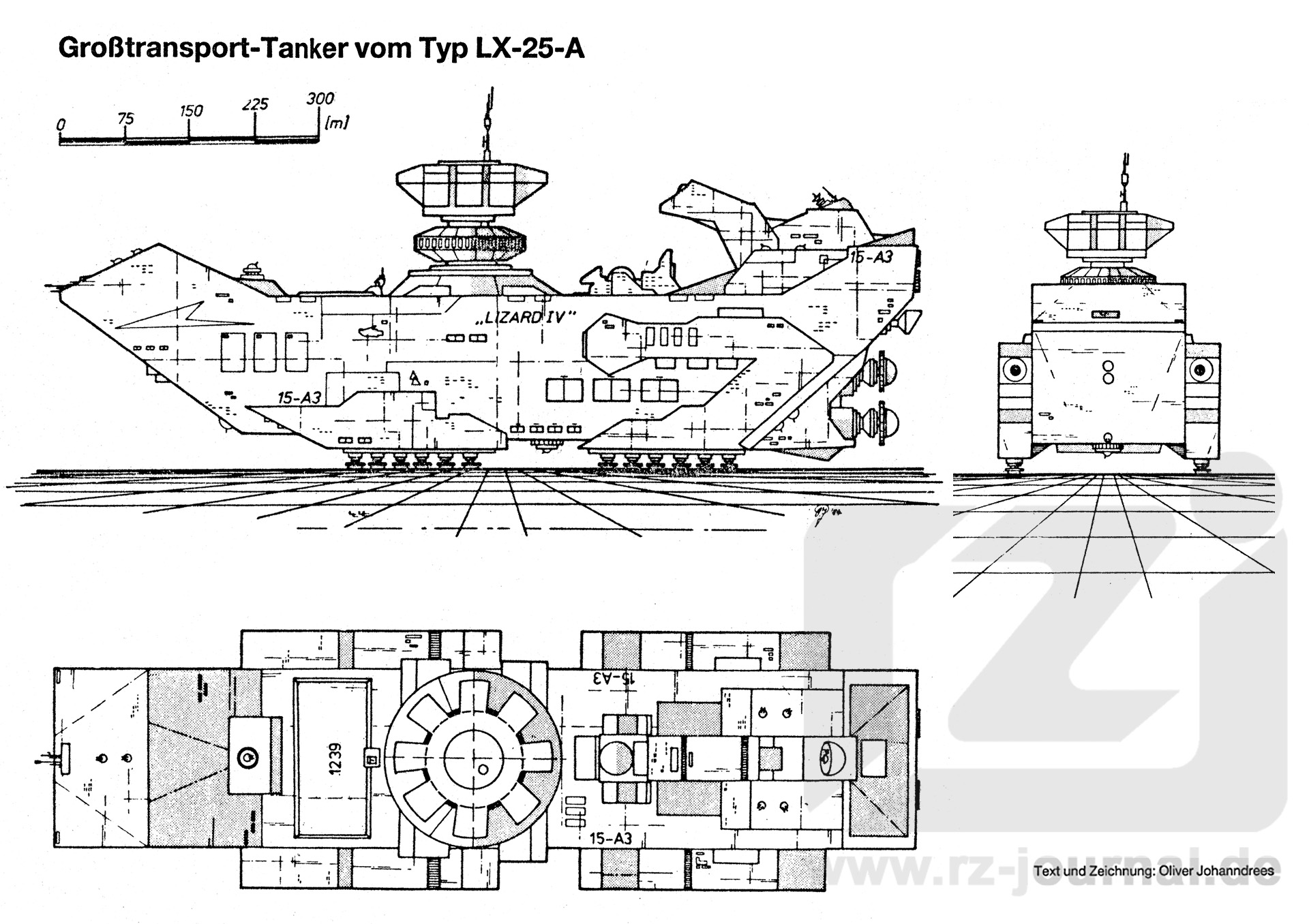 Mit der Ausbreitung der Menschheit über die Galaxis entdeckte man durch das ausgeweitete Handelssystem schnell neue wertvolle Rohstoffplaneten, und vor allem private Firmen sahen eine schnelle Möglichkeit, mit wenig Geld an ein Vermögen zu kommen. Teils mit Hilfe der terranischen Flotte versuchte man, den neuen Rohstoffreichtum zunächst auszubeuten und dann in erdnahe Gefilde zu bringen. Trotz relativ gewaltigen Aufwandes mehrten sich jedoch die Transportprobleme, so daß von vielerlei Seiten der Wunsch nach besseren, leistungsfährigeren Transportern laut wurde. Schon 10 Jahre nach Entdecken der wertvollen Rohstofflager brachte die Firma „HUMAN TERRA TRANSPORT INCORP.“ (kurz HTTI) das erste Schiff der LX-Reihe auf den Raumschiffmarkt. Der für eine solche Schiffsart doch relativ gewaltige Fest- und Flüssigstofftanker wurde zunächst ein Renner, die Käufer jedoch erhielten schnell einen Dämpfer, weil es große Probleme gab, gefährliche Raumsektoren anzufliegen und auf sehr „rauhen“ Planeten die Rohstoffe abzubauen und wegzuschaffen. Zu alledem machten Piratenflotten, die sich ihrerseits in ihrer speziellen Weise an dem Geschäft beteiligten, einiges Kopfzerbrechen HTTI zog es aus diesem Grunde vor, das Schiff mit behördlicher Genehmigung mit mittelschweren Waffen auszurüsten. Außerdem bestückte man das Schiff mit einem gutgestaffelten Schutzschirm, um sonstigen Gefahren des Weltraums besser begegnen zu können. Die LX-25-A-Baureihe, von denen immerhin 300 Schiffe gebaut wurden, war eine Verbesserung der ersten Version, mit den eben genannten Zusätzen. Man nannte die Transporter aufgrund ihrer Form „Lizard“. |