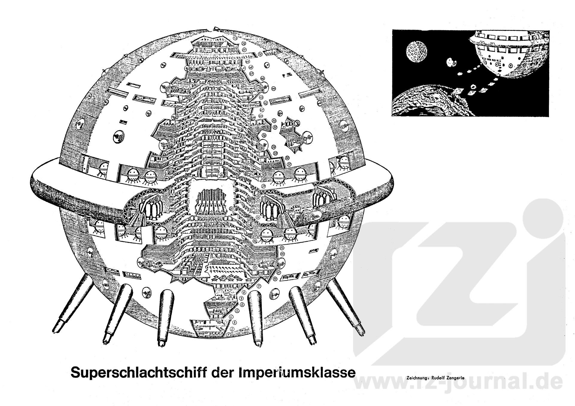 Allgemeines: 1500 m Durchmesser, 2000 Mann Besatzung, schwerste doppelwandige Terkonitstahlpanzerung, 12 Teleskoplandestützen, 54 Hauptetagen (teilweise mit je 6-7 Stockwerken), circa 270 Antigravschächte, Gleitbänder u. Rollkorridore und bis zu 20 Transformkanonen. Beschleunigung 500-500 km/sec. Eigene Gravitation u. Luftregenerierung. |