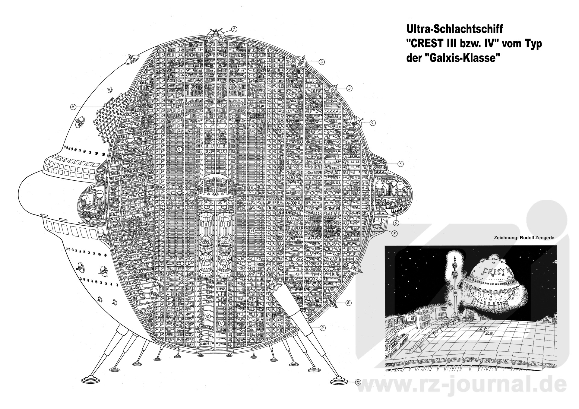 Allgemeines: 2500 m Durchmesser, 4 Kalups in Ultrakompaktbauweise siganesischer Technik, Reichweite pro Einheit 1,2 Mill. Lj. Die CREST IV besitzt somit 4,8 Mill. Lj. Reichweite ohne Austausch eines Kalups, 24 Teleskoplandestützen mit der Auflagefläche der Bodenteller von 60000 qm, 20 Normal-Korpuskulartriebwerke im Kompaktbau mit etwa 40-fach erhöhter Schubleistung gegenüber den Imperiumsraumern, 12 Großkraftwerke zur Normalversorgung (Waffenenergiezufuhr unabhängig), Beschleunigung 650 km/sec², 3 Normalfeldschirme, 1 HÜ - Schirm doppelter Abwehrkapazität gegenüber der CREST III, 60 Transformkanonen mit 2000 Gigatonnen Abstrahlkraft pro Geschütz, stärkster Terkonitstahlpanzer in Wabenbauweise, 2 ringförmige Außenhangars ober- und unterhalb des Triebwerkringwulstes. Die CREST IV ist gleichzeitig Schlachtschiff und Trägerschiff, ohne in seiner Kampfkraft als Ultrariese geschmälert zu werden. Trägerwaffen sind: 3-Mann-ZERSTÖRER, SPACE-JETS, 500 MOSKITO-JETS und 50 KORVETTEN (KORVETTE = neuumkonstruierte 60-m-Kaulquappe mit Transformkanonen, Kalups von 200000 Lj. Reichweite, HÜ-Schirm und 20 Mann Stammbesatzung). Die CREST hat 5000 Mann Besatzung (3000 Mann Stammbesatzung und 2000 Mann für Trägerwaffen wie MOSKITOS, SPACE-JETS usw.), Hauptzentrale mit Mathelogischer Positronik, Kontrollanlagen für Radioteleskope und Feldrefraktoren, Interferometer um licht- und überlichtschnelle Eindrücke und Emissionen hyperfrequenter Energie zu messen, Bildschirme und Monitoren zur Verbindung und Direktübertragung aller wichtigen Nebenzentralen und Energiestationen. Die Schiffe dieser Klasse stellen die Flaggschiffe der Flotte. Weitere Namen: CREST III, INTERSOLAR, VESPASIAN. |