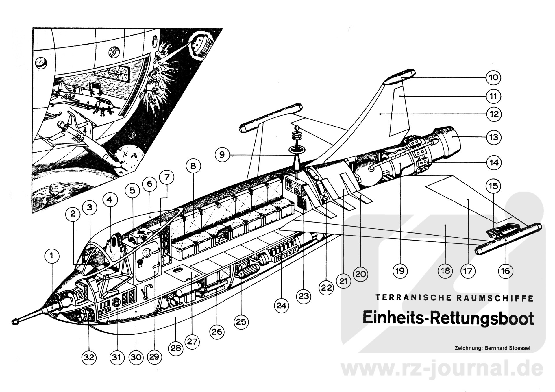 Allgemeines: Das Rettungsboot findet Verwendung in allen Handels- und Explorer-Schiffen. Es ist zwölf Meter lang und besitzt eine Tragflächenspannweite von siebeneinhalb Metern. Rettungskapazität: 15 Mann. (Ein Pilot und zwei Sitzreihen zu je sieben Mann). |