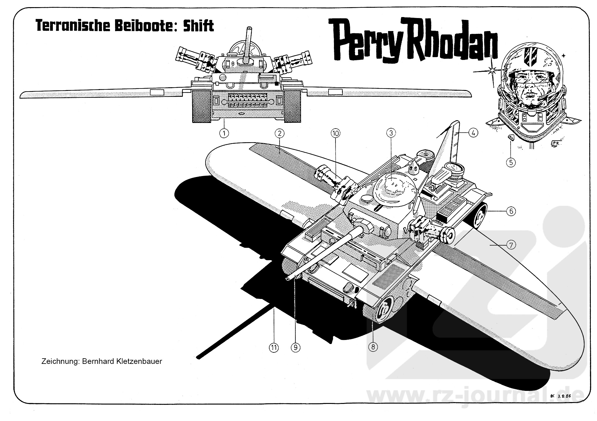 ALLGEMEINES: Die Flugpanzer vom Typ SHIFT werden üblicherweise auf kleinen und mittelgroßen terranischen(Kampf)-Raumschiffen als Beiboote eingesetzt. Somit müssen sie voll Weltraumtauglich sein und auch Extremwelt-Bedingungen überstehen. Seit den interstellarer terranischer werden die verschiedensten SHIFT-Versionen eingesetzt, die jeweils dem neuesten Stand der Technik entsprechen und meist auf höchstmögliche Kampfkraft konzipiert sind. Das hier gezeigte Modell ist mit einem Antigravtriebwerk und Gleiskettenantrieb ausgestattet. Die Bewaffnung besteht aus einer langläufigen Gravo-Intervalldruck-Kanone und zwei Transformkanonen in Kompaktbauweise. Gegen jedwede Widrigkeiten kann das Fahrzeug durch verschiedenartige Schutzfelder bewahrt werden. Durch die umfangreiche technische Ausrüstung ist die Zahl der Besatzung auf maximal 3 Terraner beschränkt |