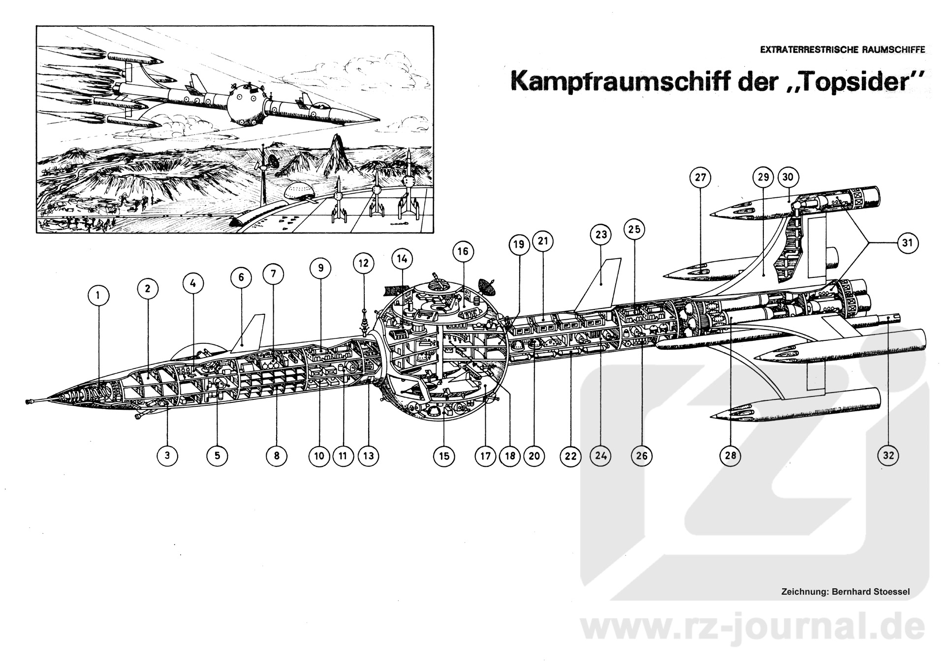 Allgemeines: Die Topsider sind ein von Echsen abstammendes Volk aus dem System Orion-Delta. Sie gelten als besonders kriegerisch, wurden aber von den Terranern zunächst überlistet und dann entscheidend geschlagen. Dieser Schwere Kreuzer der Topsider ist dreihundert Meter lang und besitzt einen Rumpfdurchmesser von achtzehn Meter. Die zentrale Kommandokugel durchmißt achtundvierzig Meter. Heckspannweite: Achtundsiebzig Meter. Besatzung: 150 Mann. |