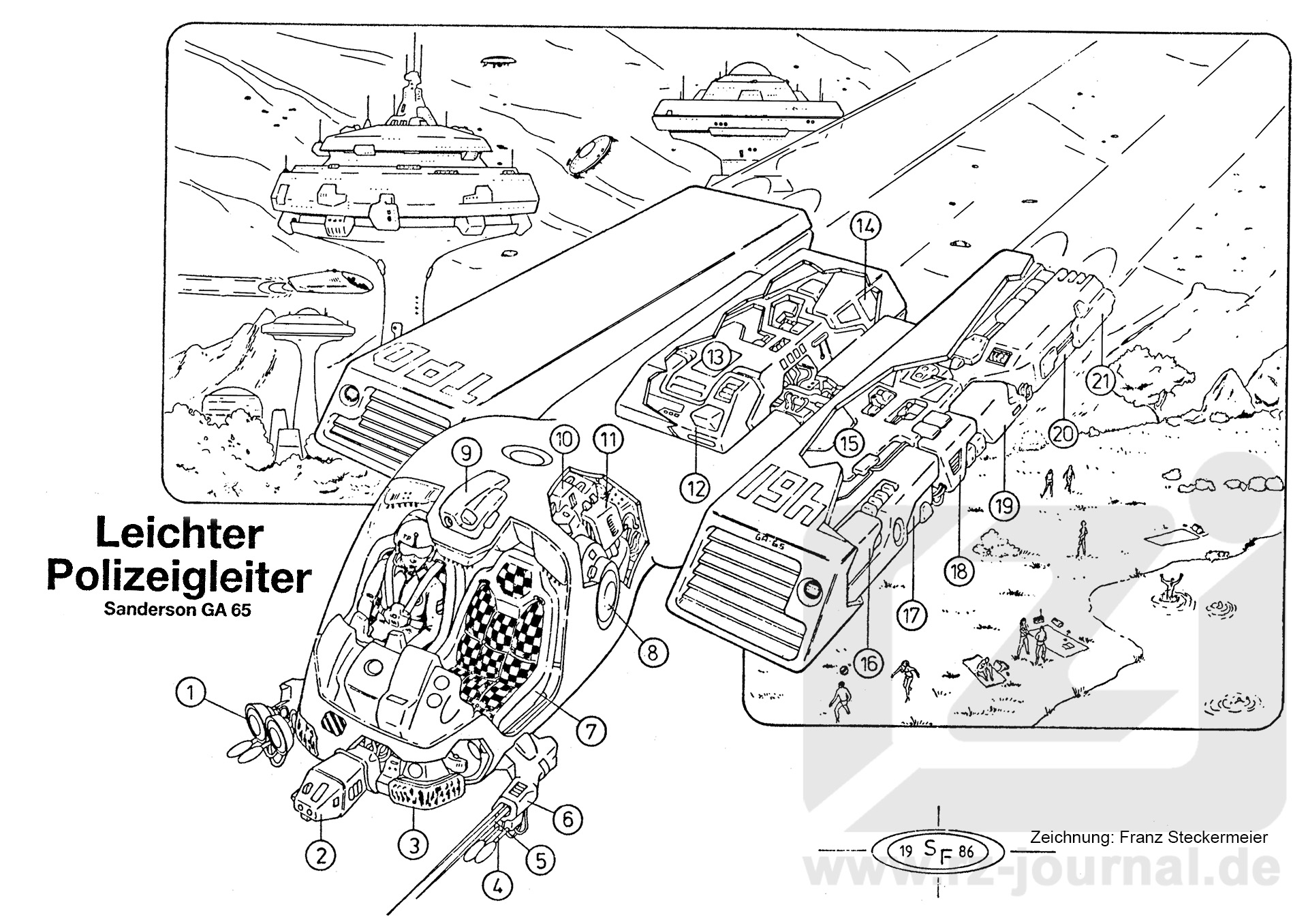Anfang des 21. Jahrhunderts entschlossen sich die ersten Terranischen Bundesstaaten, zusätzlich zu den bisher üblichen Polizeihubschraubern einen schnellen und wendigen Polizeigleiter einzuführen. Den Zuschlag für diesen Großauftrag erhielt die Firma Sanderson in Sidney. Dieser Einheitsgleiter, der wegen seiner ausgezeichneten Flugeigenschaften bei den Piloten immer mehr an Beliebtheit gewann, wurde größtenteils zu Kontroll- und Überwachungszwecken eingesetzt. Die Ausrüstung des GA 65 wurde aber auch dazu ausgelegt, um bei Einsätzen die Bodeneinheiten zu unterstützen. Auch das Zivilmodell, der GA 64 S, blieb über viele Jahre hinweg ein Verkaufsschlager. Besatzung: 2 Mann; Breite: 3,78 m; Länge: 8,65 m; Höhe: 2,34 m (mit Landestützen); Startgewicht: 9725 kg; Höchstgeschwindigkeit: Mach 9; max. Flughöhe: 18000 m. |