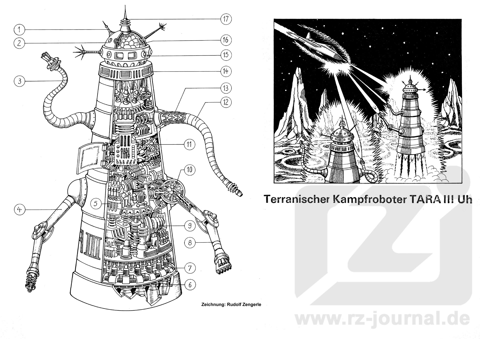 Allgemeines: Überschwerer Kampfrobot aus YT-Stahl (YT-Stahl ist eine Legierung aus Ynkelonium und Terkonitstahl), Größe 2,50 m, kegelförmig, Grundplatte 90 cm 0, flugfähig in Atmosphäre und Weltraum unter Erreichen von allerhöchsten Beschleunigungswerten, aktionsfähig ebenso über Land und unter Wasser; Grundprogrammierung findet bereits bei der Herstellung statt und zwar nach den „Asimovschen Gesetzen". Der Roboter bewährte sich zum erstenmal bei Perry Rhodans Zeitreise mit dem Nullzeitdeformator. Die mitgeführten Roboter standen unter dem Kommando von Dr. Voigt Gosling. |