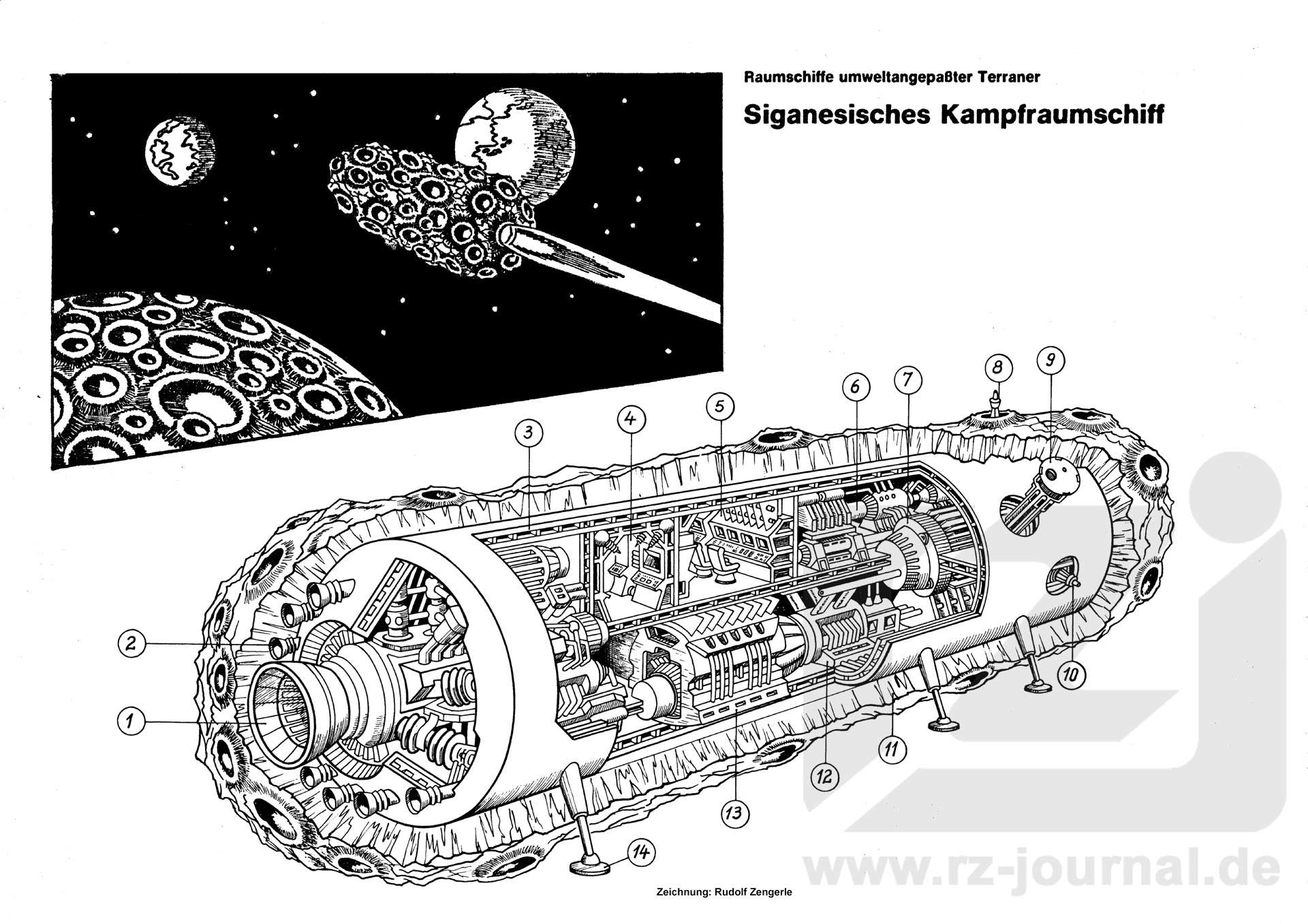 Allgemeines: Siganesisches Kampfraumschiff, zylinderförmig, Länge 1,12 m, Durchmesser 0,82 m. Mit echtem Gestein als Meteor getarnt, das im Schmelzverfahren aufgetragen wird, Schalendicke 10 cm. Die Oberfläche ist rau und zerklüftet Strahldüsen der Triebwerke, Schußwaffen, ausfahrbare Antennen und die Luftschleuse sind teils mit verschiebbaren Bodenplatten oder als kleine Krater getarnt; drei Mann (Siganesen) Besatzung. |
