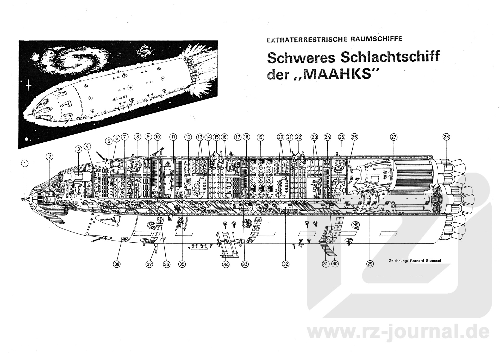 Allgemeines: Mit einer Länge von 2500 m und 500 m Durchmesser ist es das größte und stärkste (Kriegsschiff der Maahk- Rotte. Es hat 2000 Mann Besatzung und kann weitere 3000 Mann ah Raumlandetrupps« aufnehmen. Es hat 14 Landestützen mit je 2 Teleskoplandebeinen und einer Gesamtauflagefläche von 70 000 qm. Das Raumschiff ist in 31 Hauptetagen aufgeteilt, die mit 21 Personen- und 2 Lastenantigravschächten verbunden sind. Außerdem hat es eine schwere doppelwandige Rumpfpanzerung. Die Höchstbeschleunigung beträgt 5500 km/s² |