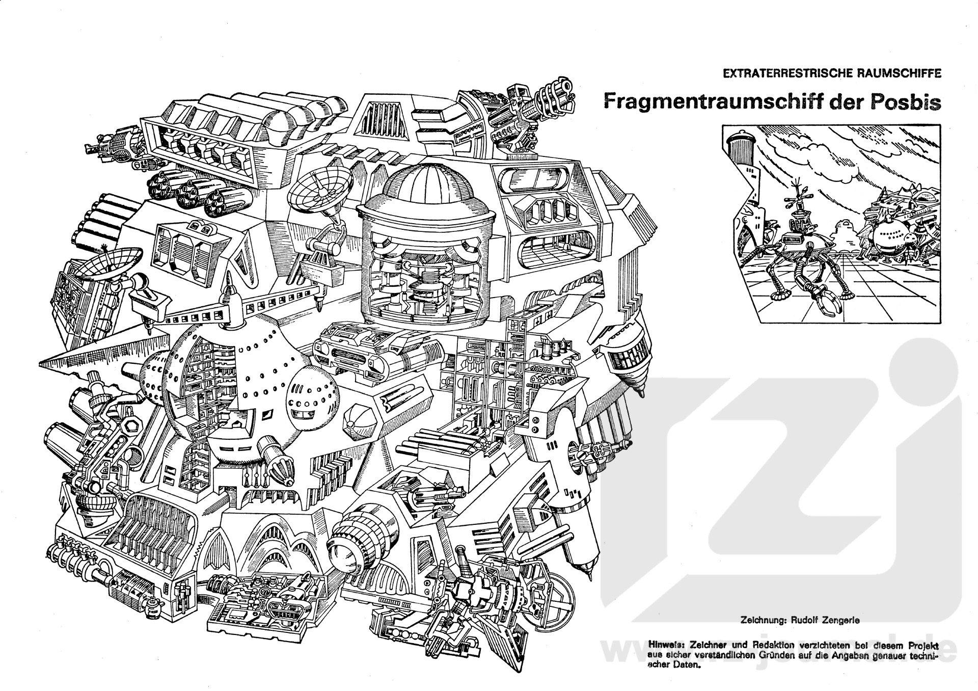Allgemeines: Das Fragmentraumschiff der Posbis ist ein asymmetrisches Gebilde von ungefährer Würfelform, jedoch sind auf den geraden Flächen des Würfels überall Auswüchse, Türmchen, schwenkbare Antennen, Plattformen, eigenartige geometrische Flächen, Kugeln usw. zu sehen. Das Raumschiff besitzt eine Seitenlänge von 2000 Meter. Die Posbis nennen ihre Raumschiffe BOX-1 usw. Die Bewaffnung der Fragmentraumschiffe besteht in erster Linie aus Transformstrahlern. Posbi - Abkürzung für positronisch- biologischen Roboter. Die Posbis besitzen biologisch lebendes Nervenplasma und positronische Gehirne. Ihre technische Heimatwelt ist Frago, die Heimatwelt des Plasmas ist die Hundertsonnenwelt. Der terranische Kybernetiker Van Moders prägte für das positronisch-biologische Gehirn der Posbis die Bezeichnung „Hyperinpotronik“. Die Verbindung zwischen Plasma und Positronik bezeichnete er als „hypertoyktische Verzahnung“. Die Posbis wurden nach anfänglichen Verständigungsschwierigkeiten die treuesten Verbündeten des Solaren Imperiums. |