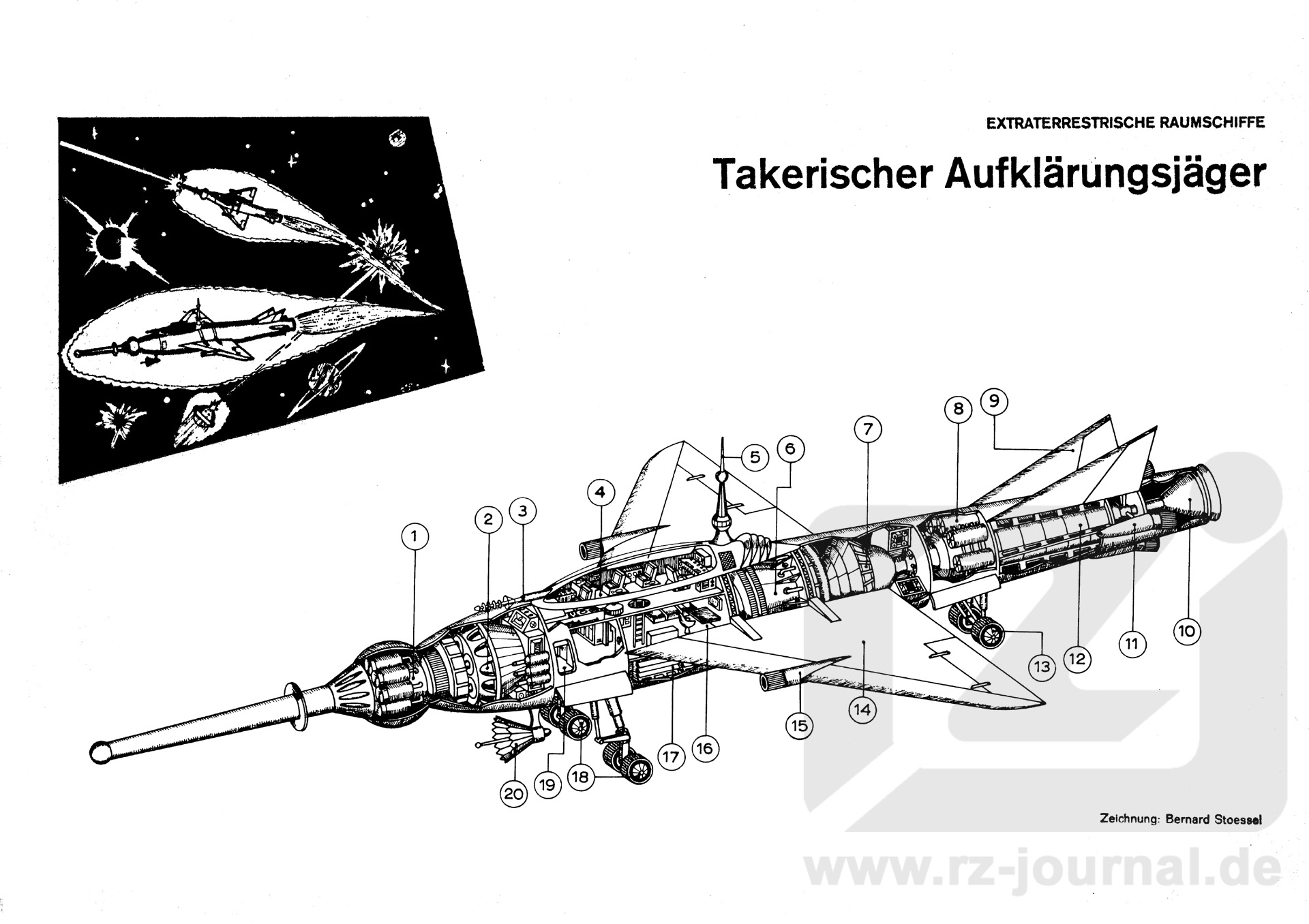 Allgemeines: 50 m lang; 22 m Spannweite; Rumpfdurchmesser: 5 m: Heckdurchmesser: 3 m: 4 Mann Besatzung; Höchstbeschleunigung: 750 km/sec.² Durch Lineartriebwerk überlichtschnell. Für Flug in planetarischer Atmosphäre und im Weltraum geeignet |