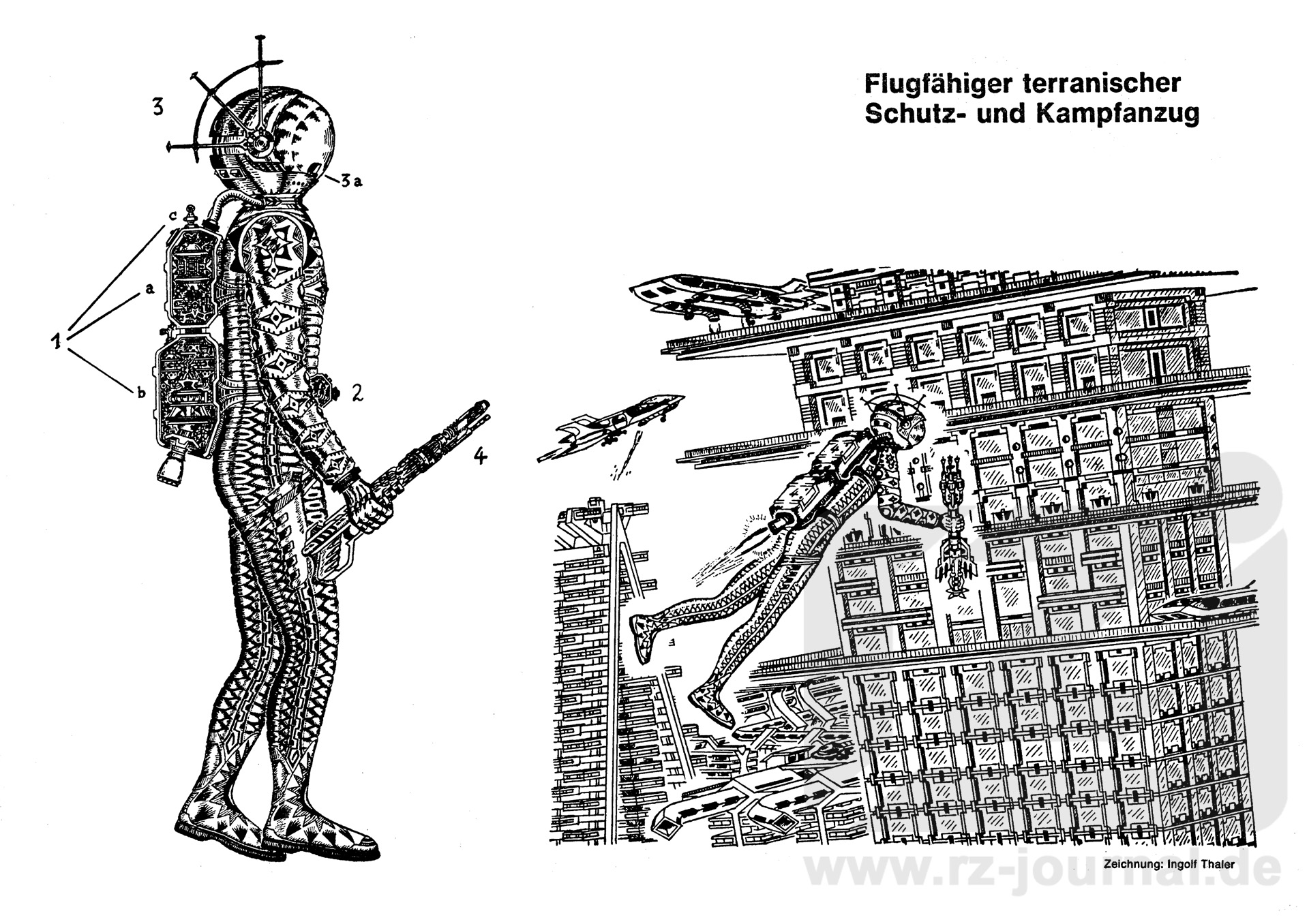 Allgemeines: Flugfähig Im Weltraum und in der Atmosphäre. Besteht aus elastischem und widerstandsfähigem Material. Der Rückentornister wird über den Schaltteil des Kombinationsgürtels gesteuert. Der Anzug bietet Schutz gegen Überdruck und Druckverlust, sowie gegen Primitiv- und Energiewaffen. Der Rückentornister ist ein Produkt siganesischer Mikrotechnik. |