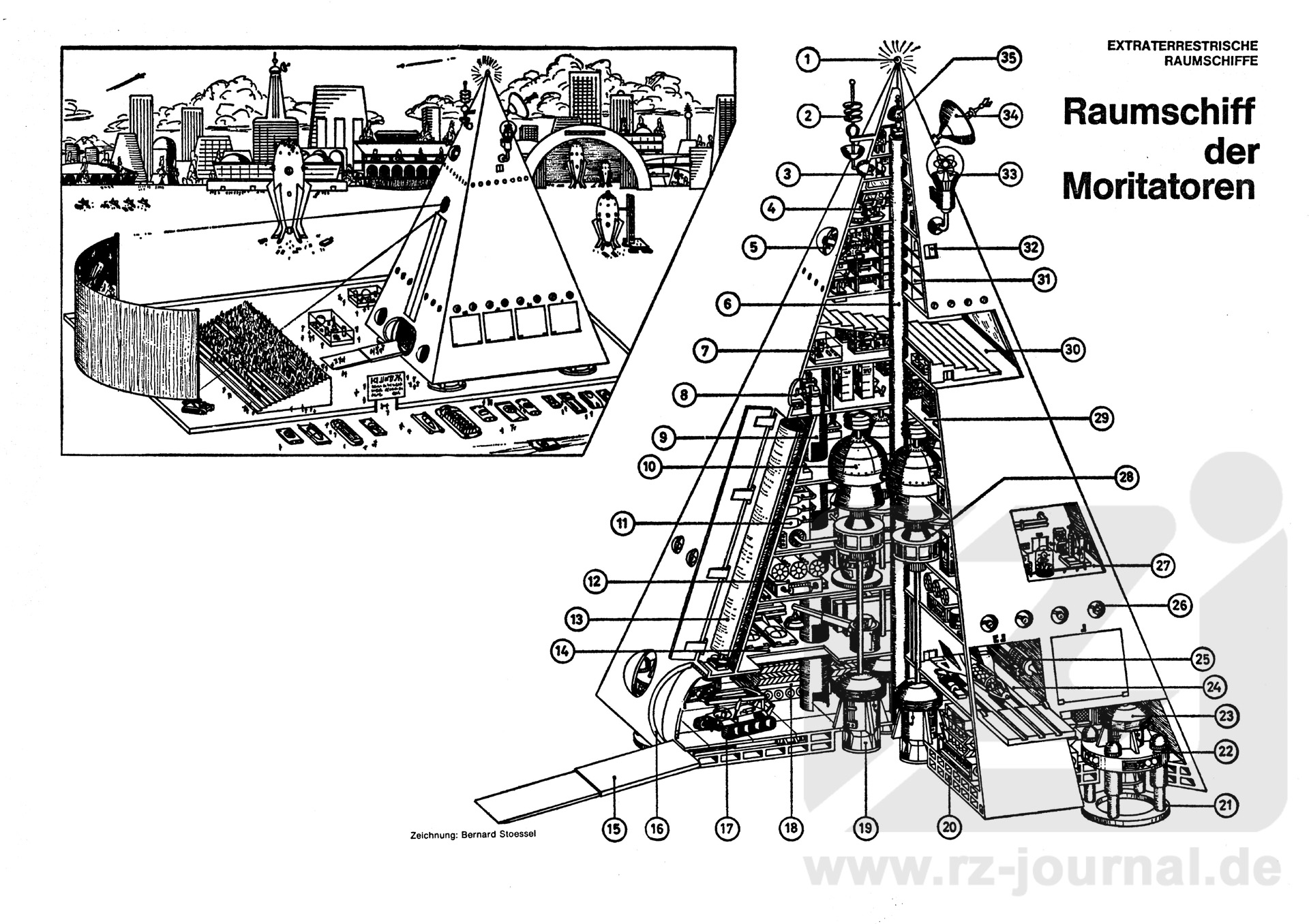 Allgemeines: Pyramidenförmiges Raumschiff der Moritatoren aus Gruelfin (NGC 4594). Gesamtlänge: 155m; Kantenlänge der quadratischen Heckplatte: 100 m; Höchstbeschleunigung: 350 km/sek²; Besatzung: 60 Mann. |