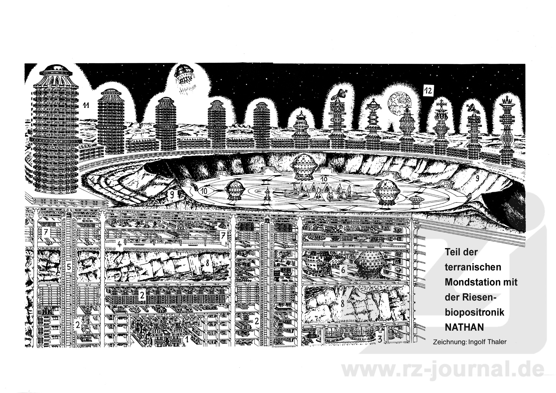 Allgemeines: Der Mond wurde vollkommen ausgehöhlt. In den riesigen Kammern und Hallen befinden sich in erster Linie die Werften, wo die Schiffe des terranischen Volkes entstehen. Zu diesen Werften gehören große Hangars, Schleusen, Reparaturanlagen, Montagehallen usw. Außerdem befinden sich auf dem Mond große Verwaltungsgebäude, die Riesenbiopositronik NATHAN und viele Spezialabteilungen des Solaren Imperiums. |