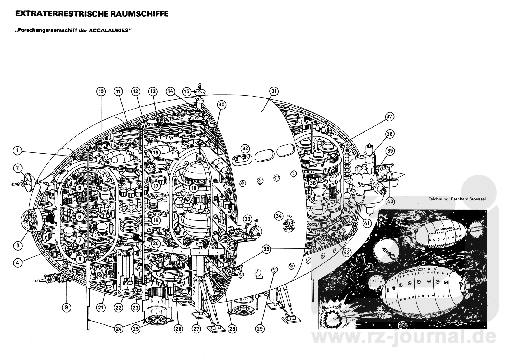 Allgemeines: Dieses Raumschiff wird von dem aus einer Antimaterie-Galaxis stammenden Volk der Accalauries als Forschungs- und Experimentierschiff verwendet. Länge des Rumpfes: 500 m; max. Rumpfdurchmesser: 300 m. Gesamtlänge mit Unterlichttriebwerk: 550 m. Die 13 Hauptetagen werden von einer doppelwandigen Rumpfpanzerung umgeben. Die wichtigsten Schiffsteile sind zusätzlich durch drei Panzerkapseln geschützt. Zur schnellen Personen- und Lastenbeförderung dienen 8 Personen- und 2 Lastenantigravschächte, sowie zahlreiche Gleitbänder. Höchstbeschleunigung 600 km/sek². Stammbesatzung 300 Mann. Gesamtbesatzung mit Wissenschaftlern 3000 Mann. |