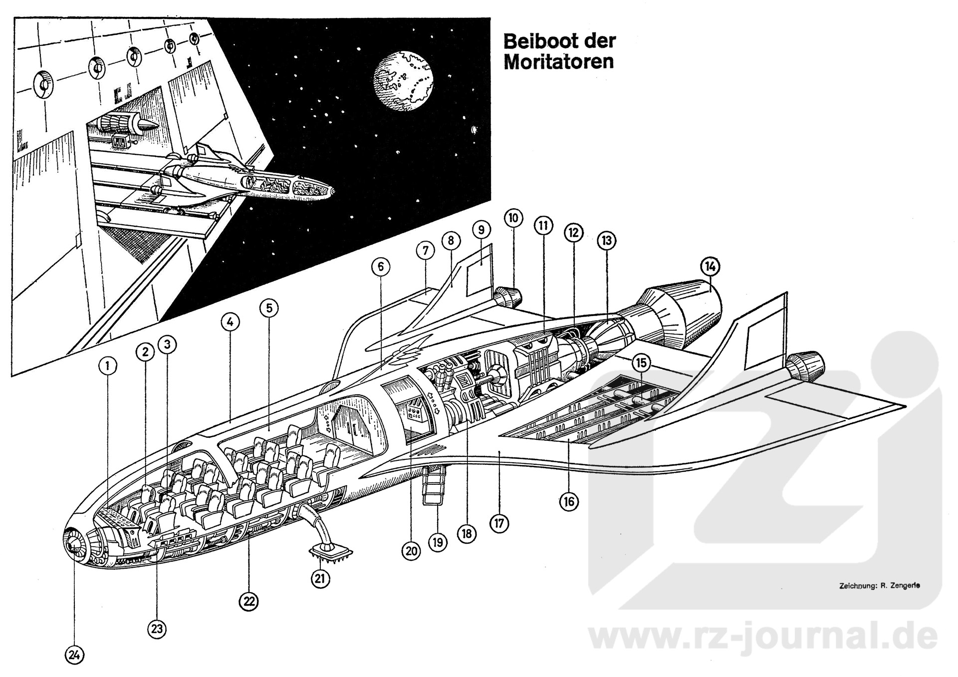 Allgemeines: Raumschiff mit aerodynamischer Form; Länge zirka 25 m; für Flug in Weltraum und Atmosphäre geeignet; Das Beiboot dient nur zur Rettung und für Kurierdienste und ist keine Kampfeinheit; überlichtschnell; maximale Aufnahme 20 Personen. |