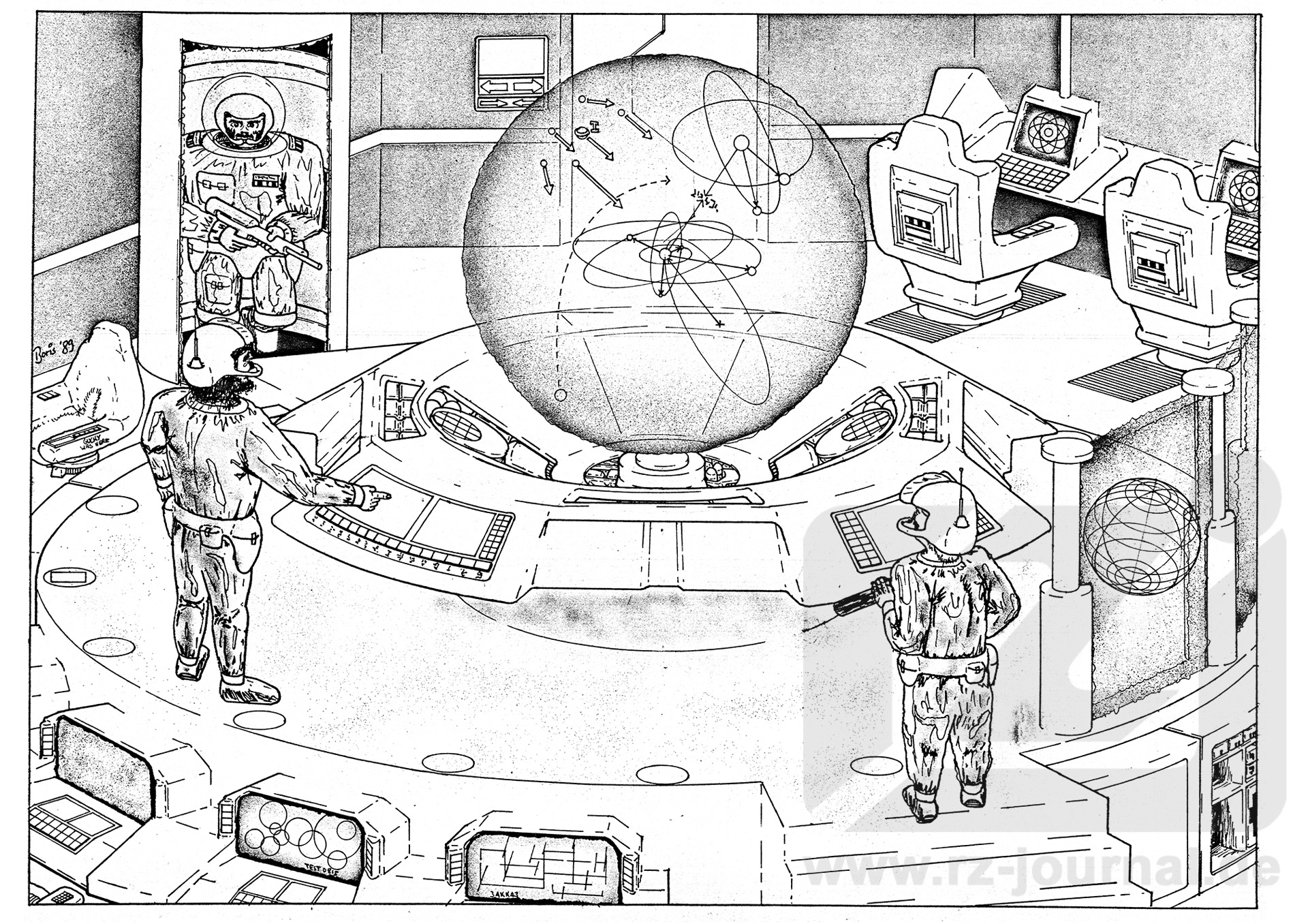 Die Ortungstechnik des 22. Jahrhunderts unterscheidet sich grundsätzlich von der in der ersten Folge beschriebenen Praxis. Die neuen Ortungsgeräte, deren Vorläufer von den Terranern in Form arkonidischer Technik übernommen wurden, arbeiten prinzipiell passiv. Während altertümliche Orter noch Strahlen aussanden und deren Rückkehr abwarteten, arbeiten die heutigen Geräte durch Analyse gegebener Raumstrukturen bzw. empfangener Hyperstrah1ung. In den modernen Raumschiffen sind beide Arten der Ortung natürlich perfekt aufeinander abgestimmt: Massetaster und Hyperorter arbeiten Hand in Hand. Der Massetaster ist ein Analysegerät, das die Struktur des 4-dimensionalen Raum-Zeit-Kontinuums auf gravitationelle Verzerrungen untersucht. Dadurch ist es in der Lage, alles, was gravitationelle Auswirkungen hat - also Raumschiffe, Planeten, Sonnen u.ä. -, recht genau anzumessen und deren Masse zu bestimmen. Dagegen kann es nur schwer Angaben über die Ausmaßen der festgestellten Objekte machen. Der Hyperorter hingegen misst charakteristische Streustrahlungen aller auf hyperdimensionaler Ebene arbeitenden Aggregate an - also Über 1ichttriebwerke, Hyperfunkanlagen, Transmitter etc. Während der Massetaster nur lichtschnell arbeitet, somit seine Reichweite eingeschränkt ist, befindet sich natürlich auch der bekannte Struktur-Taster an Bord, der ruckartige Veränderungen im RZK anpeilt, die mit 5-dimensiona1en und daher überlichtschnelle Begleiterscheinungen verbunden ist. Das Bild zeigt einen Ausschnitt aus der Ortungszentrale des bekannten terranischen Flaggschiffes IRONDUKE. Im Vordergrund ist der kreisförmige Massetaster-Kontrol1 stand zu sehen. In alle 6 Richtungen ist je ein Taster gerichtet, der über einen Pult bedient wird. Die 6 Bediener sind hauptsächlich mit der Abstimmung und Kontrolle des Gerätes verbunden. Die Auswertung erfolgt über das kugelförmige Hologramm, das vom Steuerpult in der Mitte auf der Empore aufgebaut wird. Hier arbeiten im Normalfall 4 weitere Ortungsspezialisten, außerdem halten sich oft führende Offiziere der Schiffsleitung (meist der Zweite Offizier) hier auf, um die Umsetzung in Maßnahmen aufgrund der Ergebnisse schnell zu ermöglichen. Ausschnitte oder Bildverbindungen können auf den Hologrammen am Rande der Scheibe dargestellt werden. Ähnlich Strukturiert sind auch der Hyperorterstand und der Strukturtaster. Lediglich die Normalortung ist anders aufgebaut. 22 Ortungsgeräte (symetrisch über die Außenhülle verteilt) werden an 22 Pulten (2 davon sind im Hintergrund rechts zu sehen) gesteuert, die Daten gehen direkt in die Kommandozentrale, wo sie untersucht und ausgewertet werden. Dieser Aufbau hielt sich von Beginn terranischer Raumfahrt an bei Schiffen ab 100 Mann Besatzung (mind. 16 Mann Ortungspersonal) bis weit ins 4. Jahrtausend hinein. |