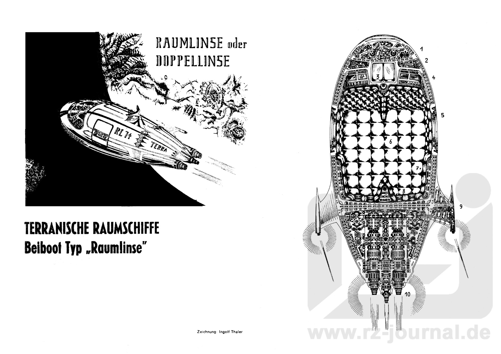 Allgemeines: Die Raumlinsen werden vor allem in Naheinsatz zwischen Raumschiffen, zwischen Raumschiffen und Planeten, sowie auf Stützpunkten eingesetzt. Sie dienen in erster Linie Beobachtungszwecken. In ihrer langgestreckten und elliptischen, flach gedrückten Form können nur zwei Menschen flach nebeneinander auf dem Bauch liegen. Die Raumlinsen werden auch Doppellinse genannt. Zwei Mann liegen in der Bugspitze nebeneinander auf dem Bauch. Die Raumlinse kann nötigenfalls aufsetzen. Die Konturlager sind mechanisch derart verschiebbar, daß als bequeme Schlafplätze bieten. Die Linsen besitzen nur ein starkes Impulstriebwerk, das einfach, lichtschnell ist. Abmessungen: Länge 6 Meter, Breite; 2 Meter, Höhe; 1,40 Meter. |