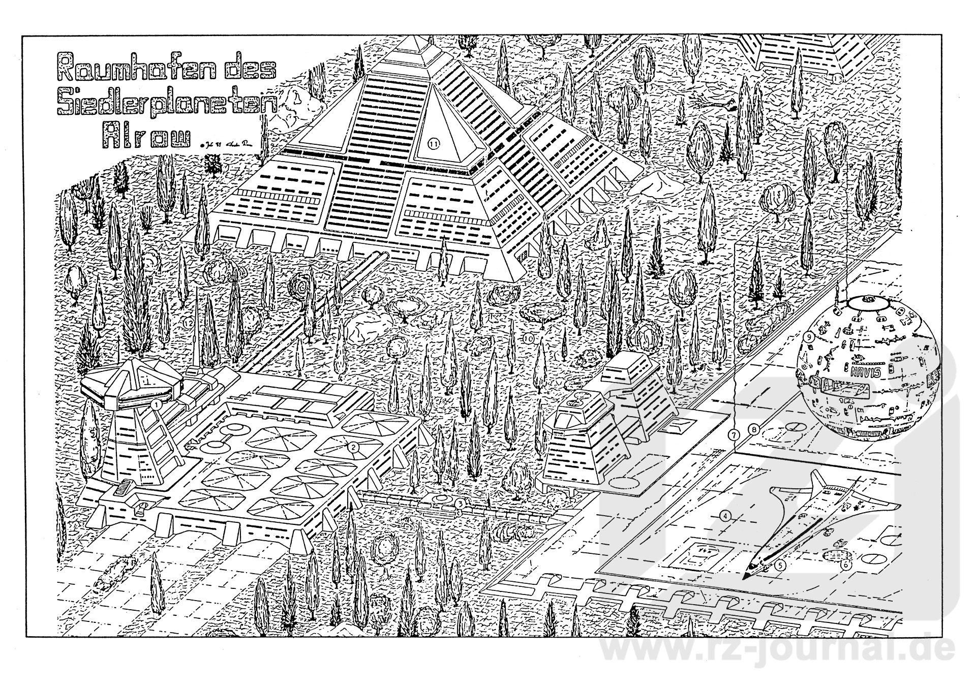 Der Planet ALROW wurde im Jahre 2748 n. Chr. von einem terranischen Explorerschiff entdeckt. Mit 13850 km Durchmesser, einer Schwerkraft von 0,96 Gravos und einem 25- Stunden-Tag ist dieser Planet der Erde sehr ähnlich. Nach einiger Forschungs- und Beobachtungszeit wurde ALROW zur Besiedlung freigegeben. So wurden ab Mitte 2781 die ersten Siedlungen errichtet. Die Abbildung zeigt einen Teil des neuen, im September 3121 fertiggestellten Raumhafens. Der gesamte Komplex nimmt eine Fläche von 225 qkm ein. Unter den Landefeldern sind außerdem Werkstätten, Lagerräume, Ersatzteilmagazine und ein Reparaturdock für Raumschiffe bis 500 m Durchmesser untergebracht. Etwa 5600 Menschen werden hier täglich beschäftigt. |