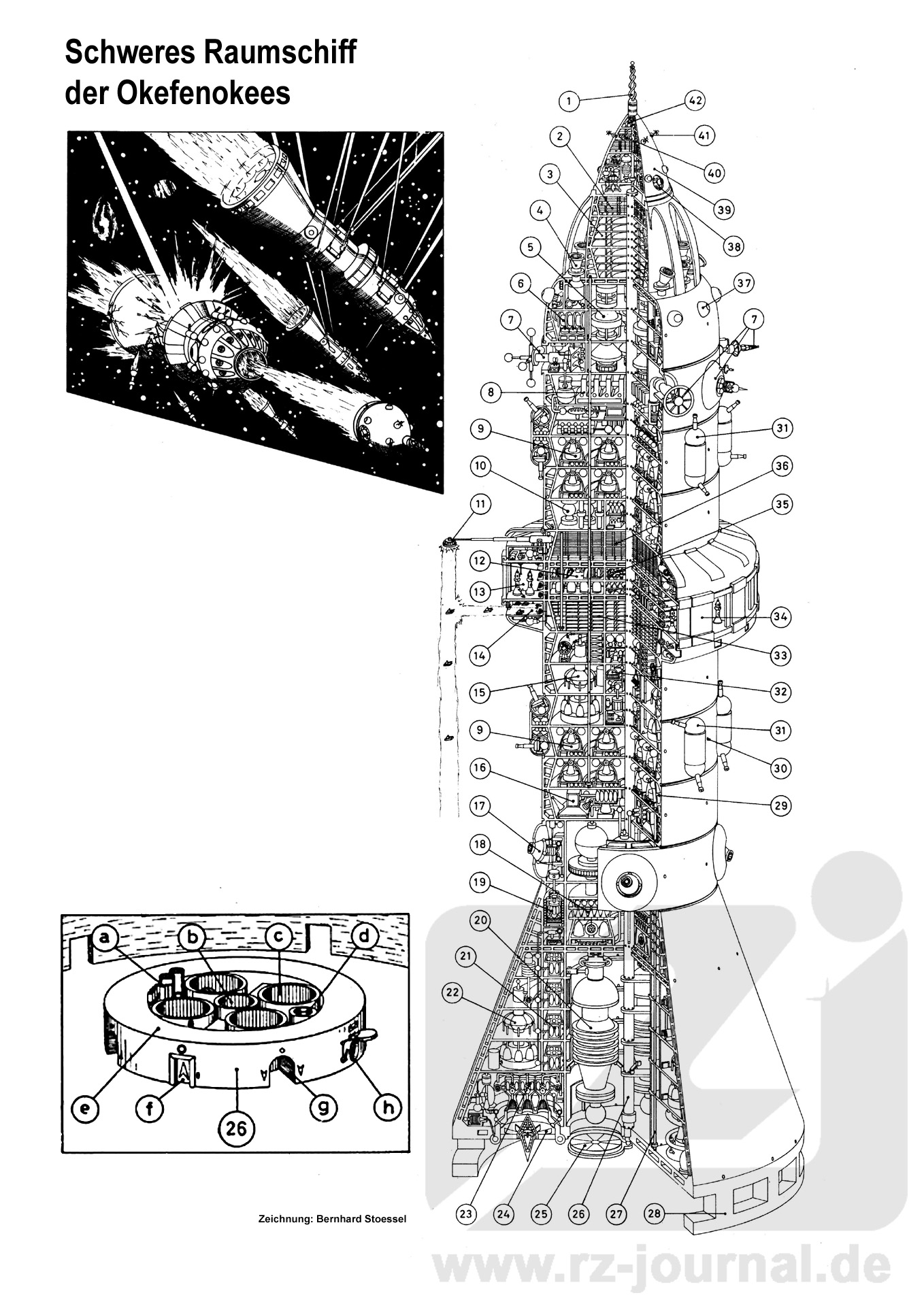 Allgemeines: Dieses Raumschiff wird von den in der Galaxis M-87 lebenden Okefenokees (auch Zentrumskonstrukteure genannt) verwendet. Die 5000- bis 7000köpfige Besatzung besteht vorwiegend aus dem Volk der Dumfries. Mit Hilfe des im Raumschiff eingebauten Dimetranstriebwerkes kann das Schiff auch Fernflüge zwischen den Galaxien unternehmen. Technische Daten: Länge: 3000 m; Rumpfdurchmesser: 500 m; Durchmesser des trichterförmigen Hecks: 1000 m; Höchstbeschleunigung: 750 km/sek². |