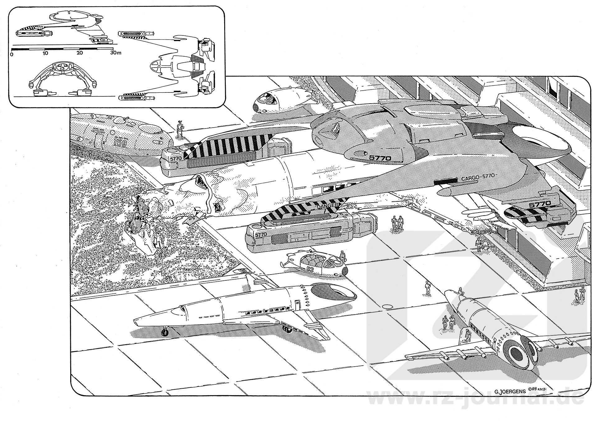Technik: Die Besonderheit, welche dem Schwerlast- Transportgleiter vom Typ CARGO 5770 sein besonderes Profil verleiht, liegt in den beiden nach vorne ausladenden Multigrav-Ankerblöcken. Diese verfügen über verschiedene, sehr leistungsfähige Antigravmodulatoren, welche in der Lage sind, Lasten der unterschiedlichsten Struktur ohne zusätzlichen Magnetanker zu fixieren. Ergänzend hierzu verfügt der CARGO 5770 hinten über zwei vektorierbare Ausleger mit kombinierten Antigrav- und Fesselfeldprojektorblöcken. Diese Kombination verleiht dem Schwerlast-Transportgleiter die Fähigkeit, selbst komplizierte Lastformen ohne Schwierigkeiten zu transportieren. |