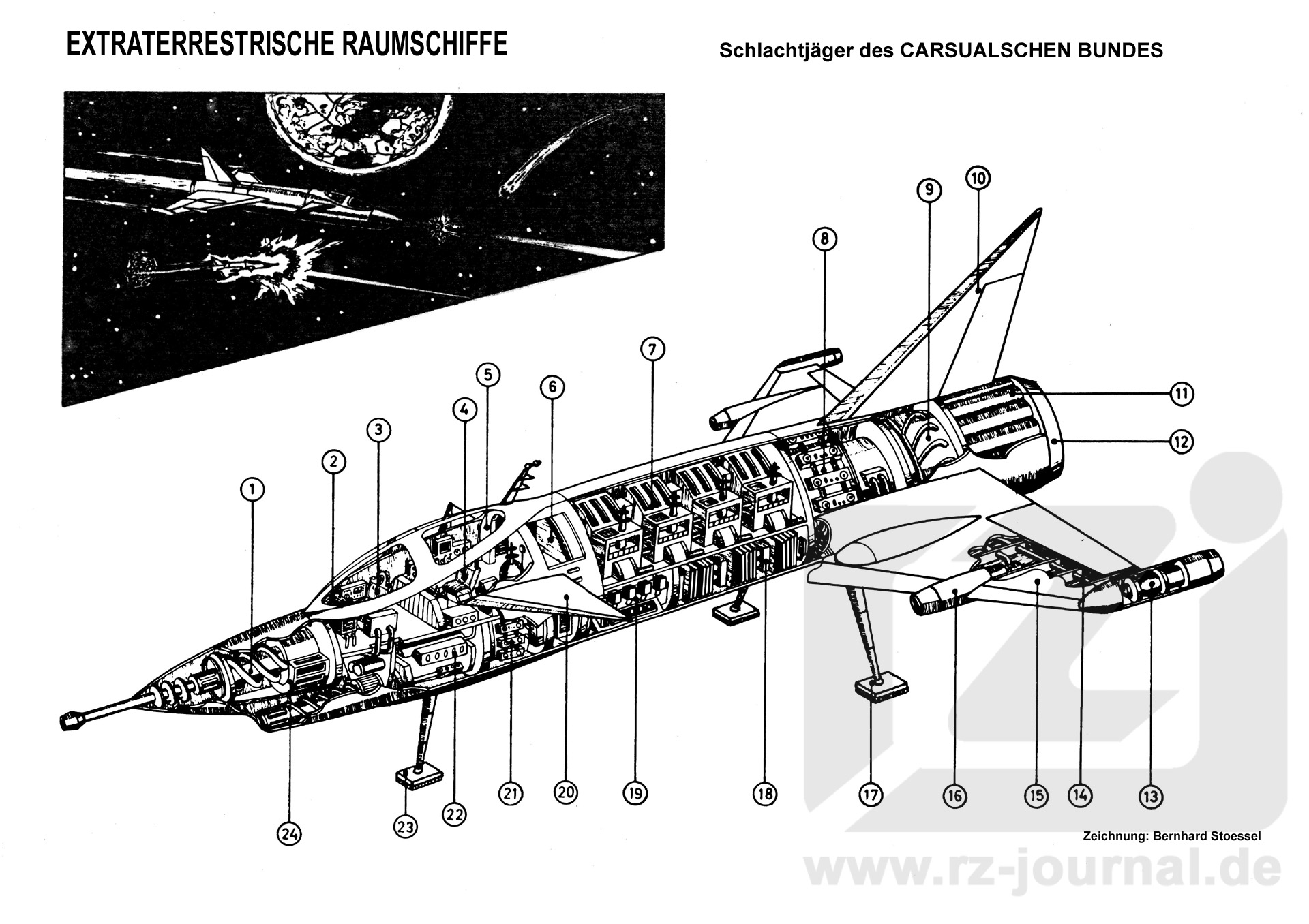 Allgemeines: Schwerbewaffneter torpedoförmiger 2-Mann-Jäger mit Deltaflügeln für den Atmosphärenflug sowie ein Lineartriebwerk für Überlichtflug. Länge: 40 m; Flügelspannweite: 30 m; Beschleunigung: 800 km/sek² |