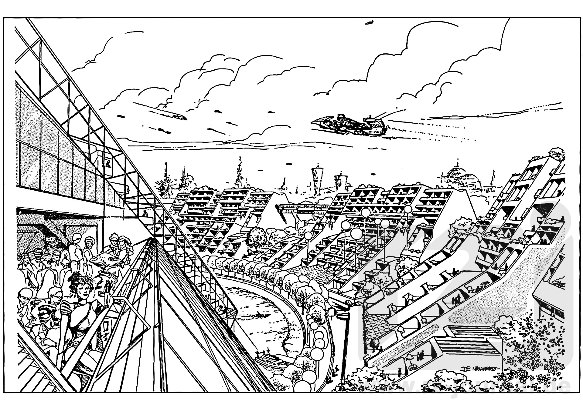 „Terrania City. Die größte Stadt auf Terra und im Solsystem. Schon seit den Tagen der Dritten Macht war Terrania das Verwaltungszentrum Terras. Wen wundert es, daß sich der zentralste aller zentralen Orte regem Zustrom an Bewohnern gegenüber sah, der natürlich immer mehr zunahm, je besser die Infrastruktur sich entwickelte, und diese Infrastruktur wiederum entwickelte sich immer besser, je mehr Einwohner sie zu versorgen hatte. Natürlich mußten sie untergebracht wenden, und ihre Ansprüche diesbezüglich waren nicht gering. Schließlich soll das Leben gerade auch in einer Multimetropole wie Terrania so angenehm wie nur möglich sein. Vielen ist - wenn ich wenn ich dieses Negativbeispiel anführen darf - wahrscheinlich nach der Fall von lenes City auf Motar, das vor einigen Jahren in die Schlagzeilen geriet, in Erinnerung, und so wollten wir es keinesfalls machen, als es galt, das neue Wohnviertel Terrania-Nord, Bezirk;21, für doch immerhin 8000 Menschen aufzubauen. Wenn ich mich hier so umschaue, glaube ich, ist uns das gelungen.“ (Ausschnitte aus einer Rede von Maxar Kodern, Leiter des Stadtbauamts von Terrania, anläßlich der offiziellen Einweihung des neuen Wohnviertels Terrania-Nord, Bezirk 21, am 21.09.3512 A. D.) Terrania stellt sich als eine dynamische Großstadt dar: nichts ist statisch, alles unterliegt beständigem Wandel. Die zu Beginn des 4. Jahrtausends begonnene Umgestaltung der Metropole von einem „menschlichen Ameisennest“ zu einer aufgelockerten, grünen Wohnstadt hat auch im 35./36. Jahrhundert noch längst kein Ende gefunden. Immer noch entstehen neue Komplexe, werden alte beseitigt oder umgestaltet. Ein Beispiel für neu entstandene Komplexe stelle Terrania-Nord, Bezirk 21, dar, eine typische Klein-Wohnsiedlung in Terrania, ja typisch und durchaus auch richtungsweisend für alle neueren Wohnlagen in größeren Städten hauptsächlich terranischer Einwohnerschaft auf welchen Planeten auch immer. Den human-raumordnerischen Tendenzen folgend, dominieren kleinere Wohneinheiten mit verhältnismäßig großzügig ausgelegten Einzelwohnungen, wenngleich die Städteplaner es immer noch nicht ganz geschafft haben, sich von der sogenannten Großwohnlandschaft (ein beschönigender Ausdruck für z.T. riesenhafte Wohntürme und -anlagen) abzuwenden. Immerhin fielen die Gesamtheinheiten schon wesentlich kleiner aus als zu früheren Zeiten (so verfügt die gezeigte Tell-Wohnanlage gerade noch über 240 einzelne Wohneinheiten]) Sehr großen Wert legte man beim Bau auf die Individuelle Infrastruktur des Viertels. Terrania-Nord besteht aus 5 einzelnen unregelmäßig angeordneten Tell-Wohnanlagen, deren jede sich in Form eines mehr oder weniger verunglückten, mehrmals unterbrochenen und z.T, versetzten Dreiviertelfreises um einen künstlichen See mündet. Die Seen wiederum sind durch breite Kanäle und Schneisen miteinander verbunden. Vielfältige, vorn Ordnungsamt weitgehend der Phantasie des einzelnen überlassene und weitgehend nicht reglementierte Freizeitmöglichkeiten (vorzugsweise Wassersport, wie einleuchten dürfte) sind somit unmittelbar vor Ort möglich. Als Beispiele genannt seien Bootsfahrten, Aquagliding, Schwimmen und Tauchen in eigens abgeteilten Bereichen. Aus der vielgerühmten Infrastruktur gar nicht wegzudenken sind natürlich die vorbildlichen Verkehrseinrichtungen, hier in Form von blockeigenen Rohrbahnen mit Stationen in jeder Untereinheit des Gesamtblocks und selbstverständlich mit Anbindung an das regionale Netz von Terrania. Gleiterbahnhöfe befinden sich an der abgewandten (hier nicht sichtbaren) Seite der Anlage. Wohnwert wird großgeschrieben. Ausfluß dieser Philosophie sind hier in der Außengestaltung die vielfältigen integrierten Grünanlagen (die z.T. aus einheimischen, z.T. aus importierten Gewächsen bestehen), die an beiden Seiten terrassenartig ansteigenden Stockwerke mit ihren großflächigen Aussichtsfenstern und der Möglichkeit, die Absätze auch als Terrassenfläche zu nutzen, und einige Außenlifts, Gondelbahnen nicht unähnlich. Auch die Innengestaltung trägt dem Konzept Rechnung durch eine entsprechende Innenarchitektur. Trotz aller Vorteile darf nicht verschwiegen werden, daß es sich bei der gezeigten Anlage um ein Nur-Wohnviertel handelt, daß man also Dienstleistungsbetriebe und Einkaufsmöglichkeiten vor Ort vergeblich suchen wird. Teile der Öffentlichkeit und der Presse prangerten dies zum Teil recht drastisch als Fehlplanung an; Kodern bestritt dies zwar entschieden, wollte jedoch nicht näher auf die Gründe seiner Überzeugung eingehen. So mutet es dann auch fast als nachträgliche Wiedergutmachung an, daß der gesammten Wohnanlage einerseits, andererseits aber auch jedem einzelnen Block eine Art beschränktes Selbstbestimmungsrecht in ihren eigenen Angelegenheiten verliehen wurde (ein verhältnismäßig neues Konzept von „Weniger Staat im Alltag“). Dies betrifft v.s. die laufende Verwaltung, die Unterhaltung der Anlage, die hauseigenen Verkehrsmittel die Nutzung der Freizeitmöglichkeiten und natürlich soziale und kulturelle Aufgaben. (Der Gemeinsame Verwaltungsausschuß hat hier beispielsweise eine Kunstausstellung initiiert, der die gezeigten eigenartigen Kugeln am Stiel dienen. Es sind übergroße, hell erleuchtete Holokugeln, in welchen zur Zeit Tridi-Gemälde und Plastiken von Altmeistern terranischer Kunst aus dem Zeitalter der Dritten Renaissance gezeigt werden.) Trotz mancher Nachteile stieß Bezirk 21 daher auch auf ein im großen und ganzen positives Echo, und es besteht Anlaß zu der Überzeugung, daß Bezirk 21 der Neugestaltung Terranias beachtenswerte Impulse liefern wird. |