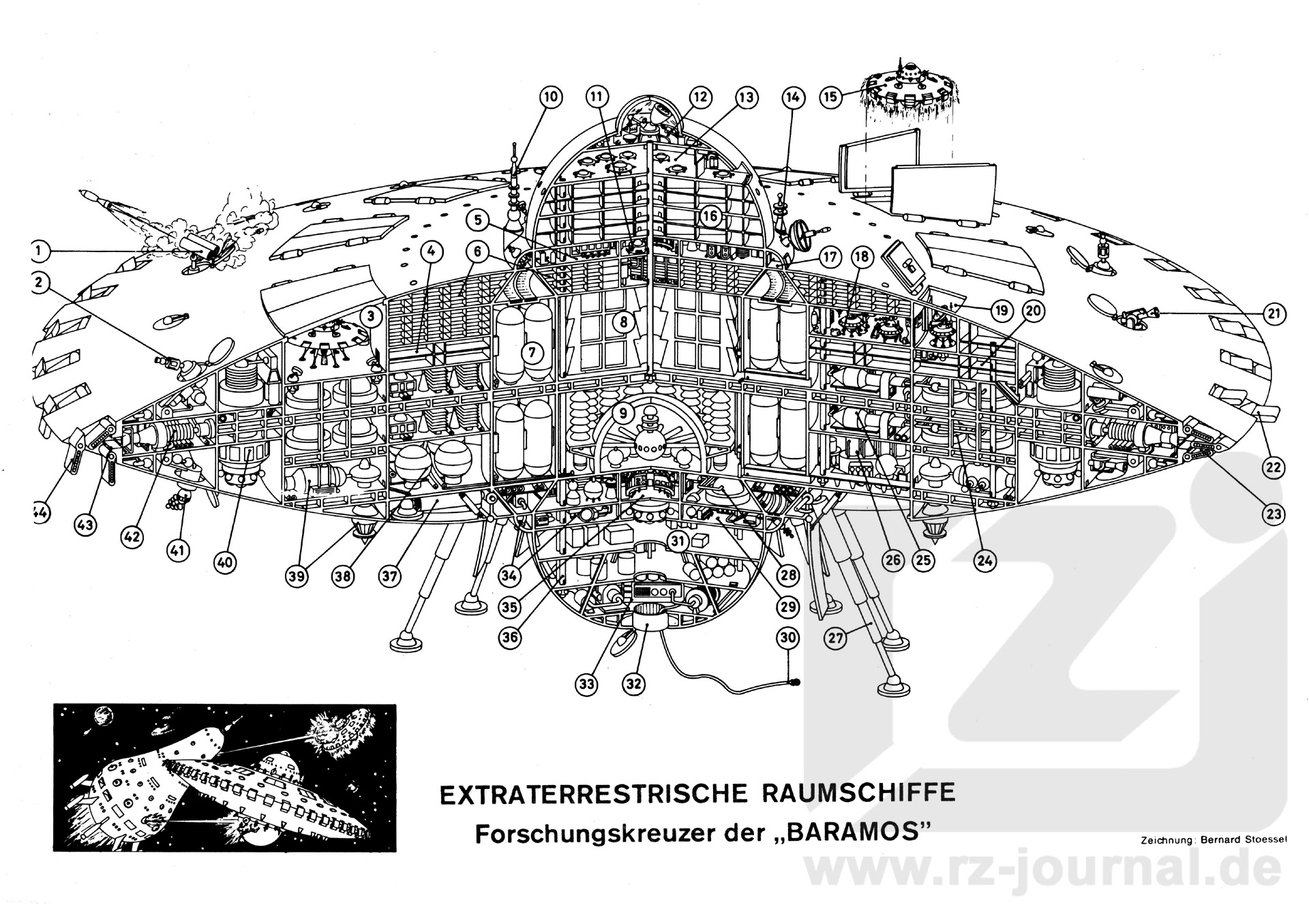 Allgemeines: Das aus der Kleinen Magellanschen Wolke stammende Insektenvolk der Baramos verwendet Raumschiffe dieses Typs sowie ähnliche Frachtschiffe, um in seinem unersättlichen Forschungsdrang Flandel mit Intelligenzen auf fernen Planeten zu betreiben. Da die Baramos außerordentlich friedfertig sind, ist ihre Raumschiffsbewaffnung unter 48 Luken verborgen und wird nur unter äußersten Notfällen ausgefahren und zur Verteidigung verwendet. Diskusförmiges Raumschiff mit 600 m Durchmesser und 120 m Flöhe; die in der Mitte befindlichen Halbkugeln haben einen Durchmesser von 120 m und geben dem Raumschiff eine Gesamthöhe (ohne Teleskopkuppel) von 240 m. Die 48 Impuls-Plasmatriebwerke arbeiten mit Wasserstoff, der als Plasma auf über 200000 m/sek beschleunigt und durch verstellbare Magnetklappen gesteuert wird. Um höheren Schub bei Starts und Landungen zu erzeugen, wird zusätzlich Sauerstoff eingespritzt. Die Besatzung besteht aus 800 Mann (200 zur Schiffsführung und 600 Wissenschaftler). |