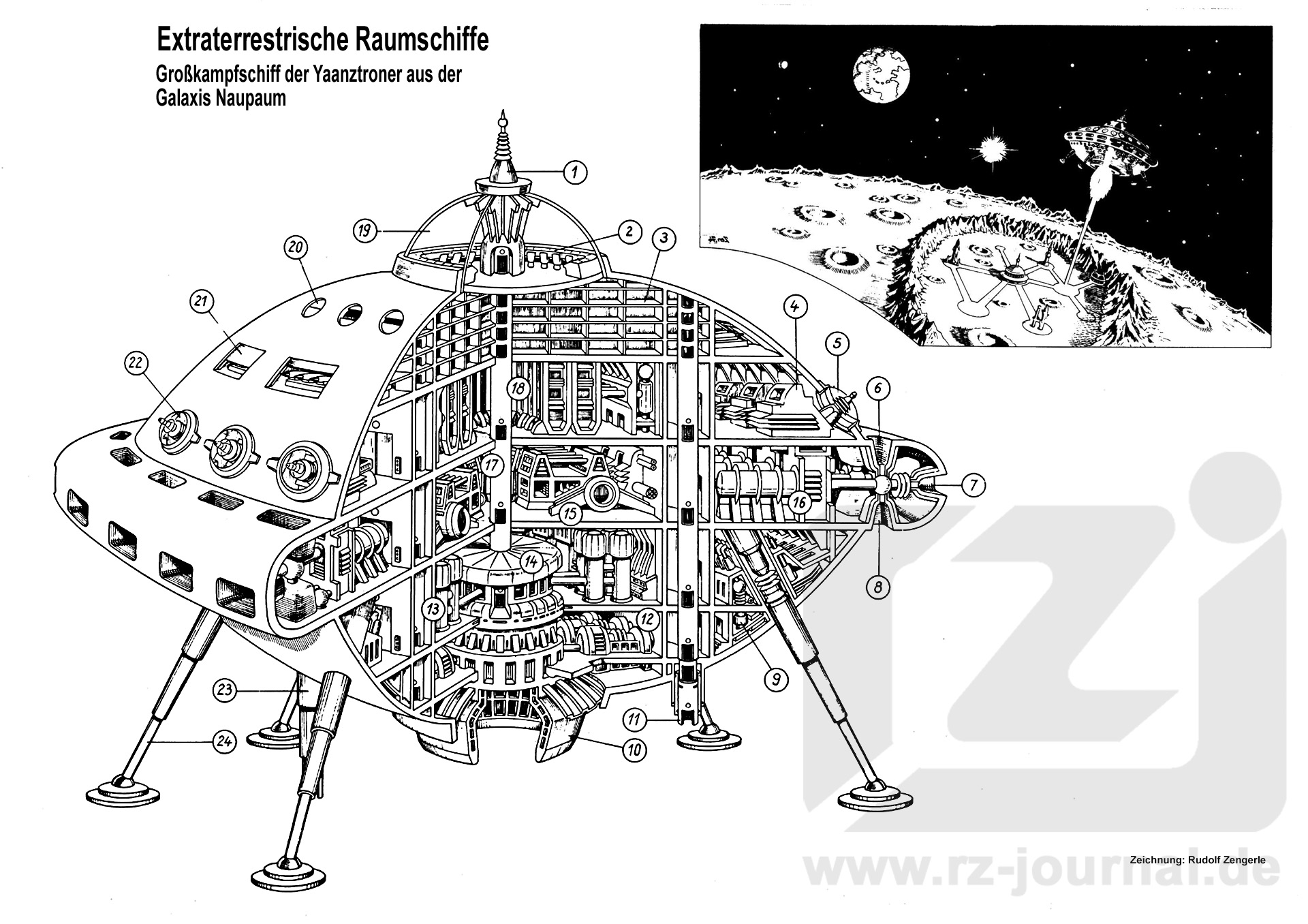Allgemeines: Ellipsenfömig; Gesamtdurchmesser am Ringwulst ca. 170 m; Höhe 125 m; Besatzung 400 Mann; überlichtschnell; Reichweite 30000 Lj.; Antigravschächte sternförmig angeordnet; alle Strahltriebwerke (72 Stück) sind autark schaltbar. |