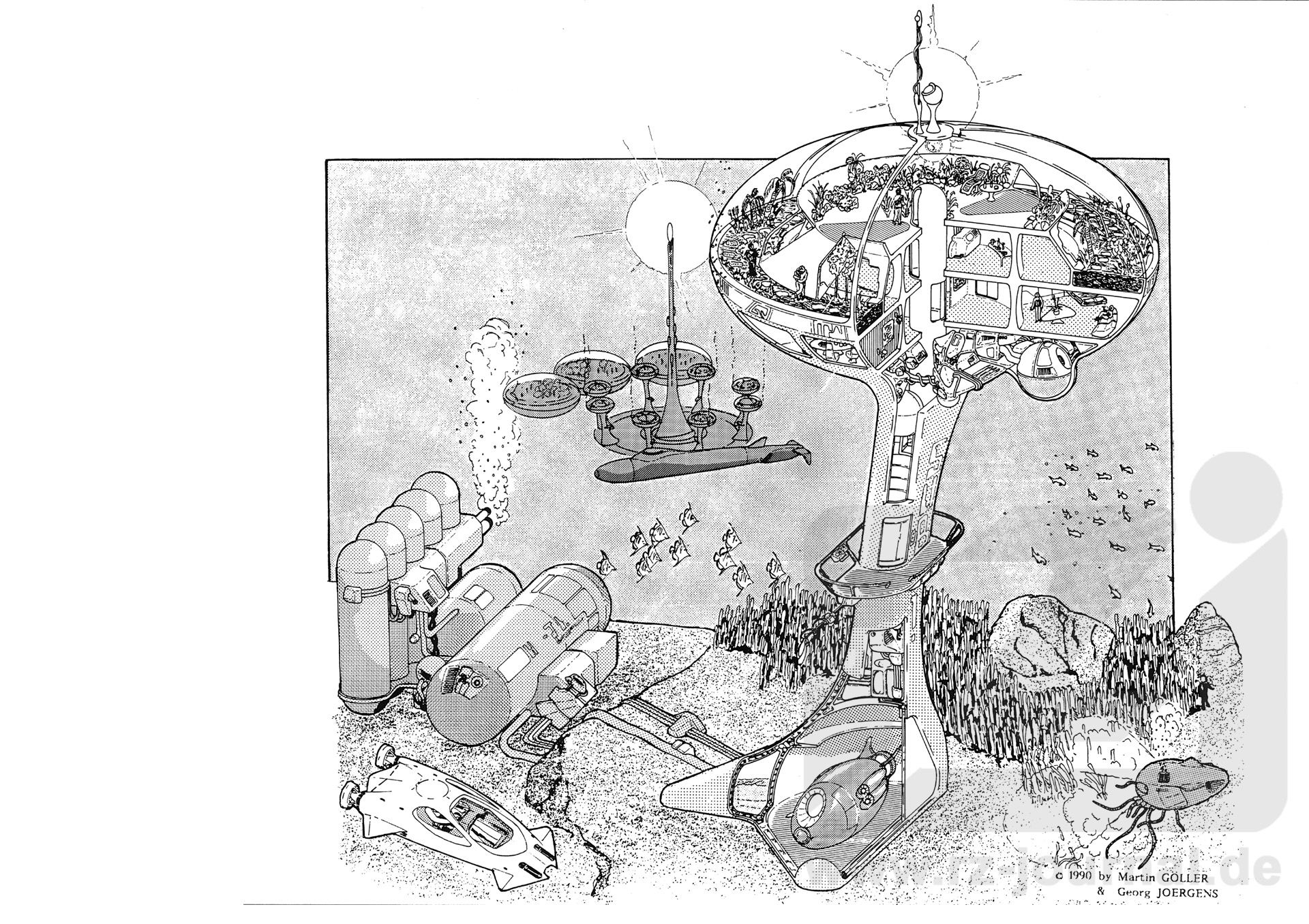 Sonstiges: Der Tiefsee-Bungalow in der Standardausführung verfügt über eine Schleuse mit einem großräumigen Amphigleiter für max. 20 Personen am Fuß der Tragfinne, sowie über zwei Kleinschleusen für Ein-Mann-Amphigleiter in der ersten Wohnebene. Darüber hinaus verfügt der Bungalow über 10 Notbojen und kann in einem außergewöhnlichen Notfall die ganze obere Wohnkuppel absprengen und mit ihr auftauchen. Einige Bungalows verfügen über einen eigenen Transmitter. Auf der Zeichnung ist im Hintergrund ein submarines Wohncenter zu sehen, in dem mehrere Bungalows mit einigen Großkuppeln zu einer „Siedlung" zusammengeschlossen wurden, die man trockenen Fußes durchqueren kann. Für größere Strecken steht eine Art „Unterwasserbus" zur Verfügung. Im Vordergrund unten links befindet sich ein Ein-Mann-Amphigleiter, wie er in jedem Tiefsee-Bungalow zu finden ist. Unten rechts sehen wir eine Erntemaschine, welche vor dem Bungalow angepflanzte Algensorten aberntet. |
