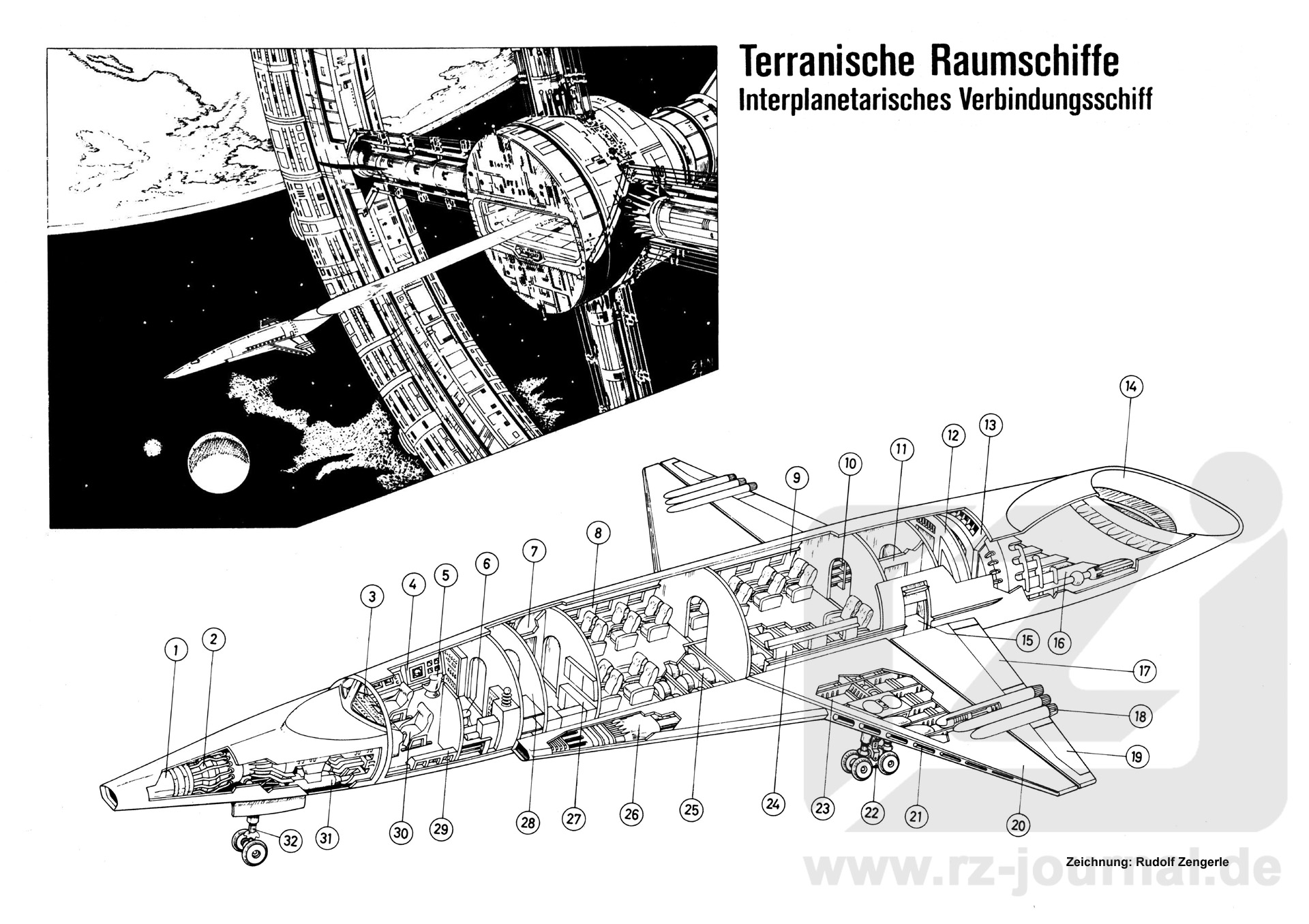 Allgemeines: Aerodynamische Form; ca. 40 m lang und mittschiffs 5 m im Durchmesser; Aktionsradius 1 Lj.; 5 Mann Besatzung zur Schiffsbedienung; Sitzplätze für 32 Passagiere; der Raketen-Jet dient als Raumtaxi und Linienschiff zwischen den Planeten des Solaren Systems und den Raumstationen, welche sich 1. in Kreisbahnen um Planeten befinden und 2. um das Solare System zum Schutz und zur Abwehr um die Sonne bewegen; das Cockpit und die Passagierräume sind vollklimatisiert und mit Andruckabsorber und Schwerkraftneutralisatoren ausgestattet. |