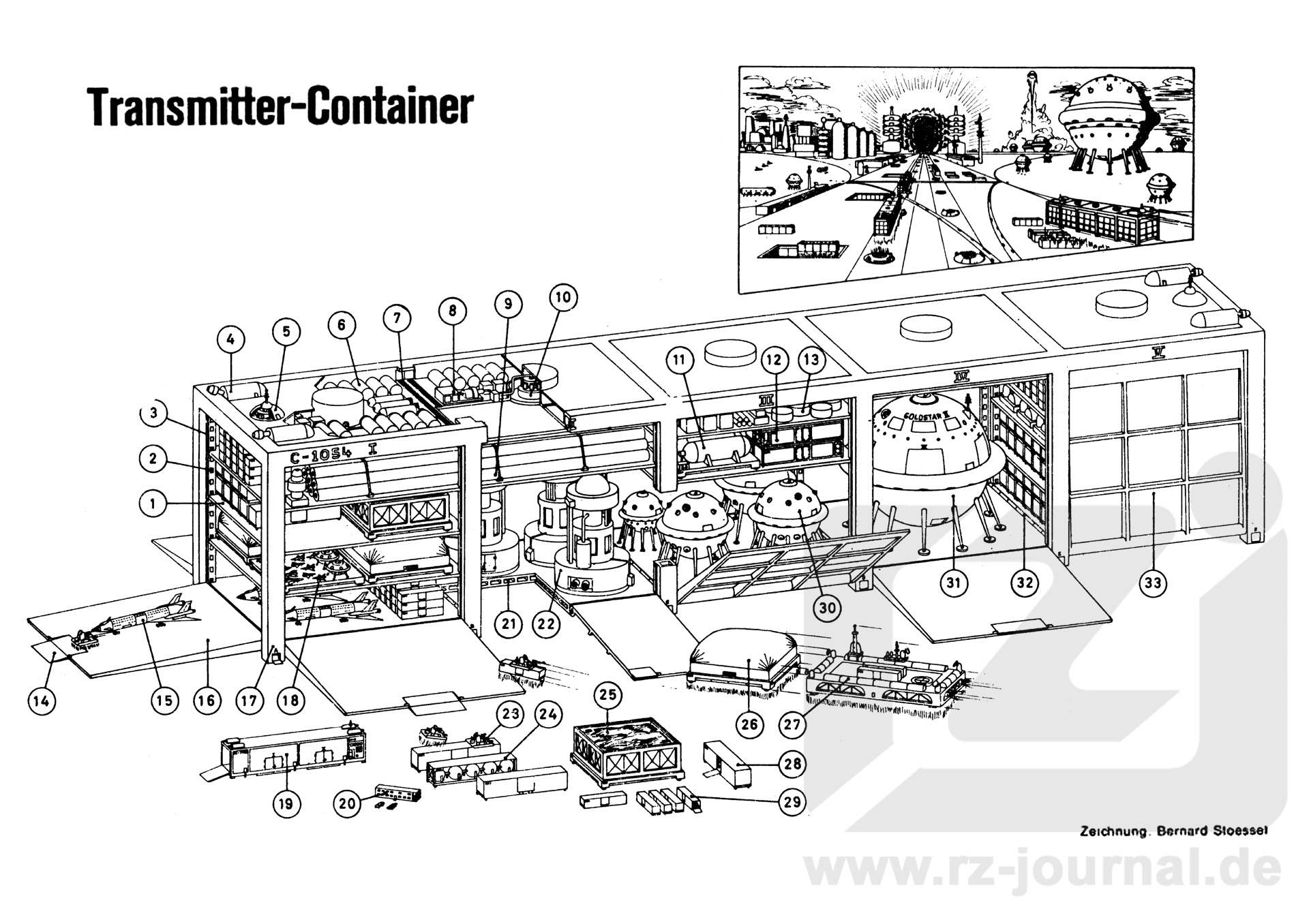 Allgemeines: Diese Container werden verwendet für den Transport von Gütern und Rohstoffen zwischen dem Sol-System und dem 6309 Lj. entfernten Planeten Olymp im Boscyk-System. Hierzu werden die raumflugfähigen Container mit Kleincontainern, Antigrav-Frachtpaletten oder anderen Gütern beladen und fliegen unter Zuhilfenahme des eigenen Antriebs oder von Antigravfeldstraßen getragen zwischen die Pole der Ferntransmitter, wo sie abgestrahlt werden. Abmessungen: Länge 1500 m; Breite 300 m; Höhe 300 m. Ladekapazität: 40 Mill. Tonnen. |
