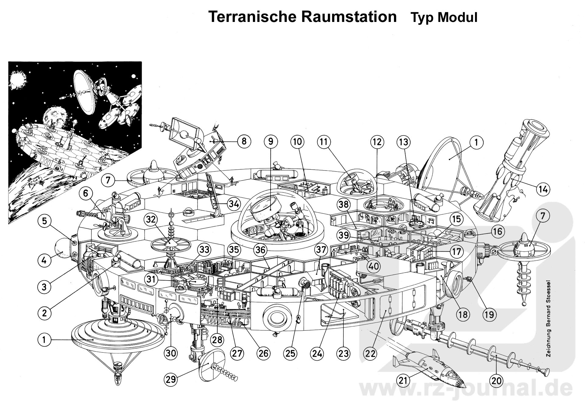 Allgemeines: Diese scheibenförmige, 100 m durchmessende und 7 m dicke Raumstation kann durch ihre austauschbare Modulbauweise für verschiedene Aufgaben verwendet werden. Die 37 sechskantförmigen Innenmodule sowie die 24 verschieden geformten Außenmodule können nachträglich im Raum für diverse Aufgaben ausgewechselt werden. Mit Spezialverbindungsröhren an den Schleusen können auch mehrere Stationseinheiten zu einer Großstation zusammengekoppelt werden. Sie kann je nach Verwendung vollrobo- tisch ausgestattet werden oder eine Besatzung von 15 bis 120 Mann haben. Innerhalb des Solaren Systems kommen sie für folgende Zwecke in Anwendung: A) Nachrichtenstation für Funk- und Videoprogramme B) Flugsicherungsstation zur Ortung und Flug bahn Überwachung von Raumschiffen. C) Wissenschaftliche Versuchsstation für verschiedene Aufgaben wie Wetterkontrolle, Astronomie, Medizin, Physik, Chemie usw. D) Industrielle Fertigungsanlage für spezielle Produkte, die nur im Weltraum rationell hergestellt werden können. E) Raumhotel für Urlauber im Asteroidengürtel oder den Saturn ringen. Für terranische Kolonie-Systeme kann die Station auch als leichte Raumfestung mit Transformkanonen und verstärkten Schutzschirmen verwendet werden. |
