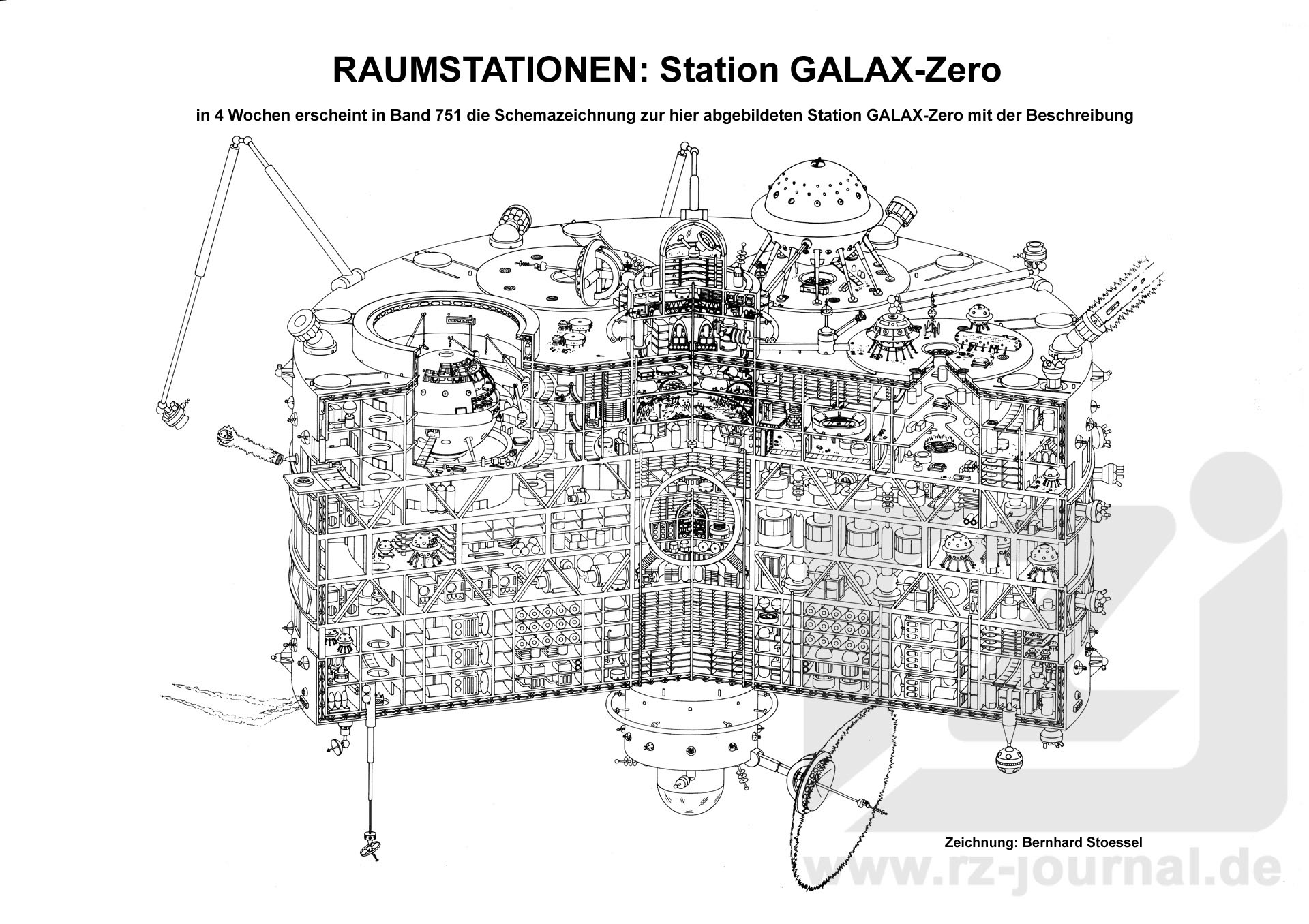 Allgemeines: GALAX-Zero steht im Koordinatenmittelpunkt zwischen Terra, Quinto-Center und den galaktischen Reichen der Akonen und Arkoniden. Sie dient als Funkfeuer und Relaisstation, außerdem als Handelszentrum. Die Stammbesatzung der vollrobotischen Station besteht aus 2000 Raumfahrern. Dazu kommen 10000 Besatzungsmitglieder der Wachraumschiffe. Zusätzlich können bis zu 500000 Menschen in der Station aufgenommen werden. Die Station hat die Form eines riesigen Zylinderschnittes von 6000 m Durchmesser und einer Dicke von 2500 Meter. Auf den beiden 1000 m durchmessenden und 500 m hohen Zentrumstürmen sind die Kuppeln der Astronomischen Station aufgebaut. Sämtliche Hauptdecks sowie die in doppelter Wabenbauweise hergestellten Außenwände bestehen aus widerstandsfestem Ynkelonium-Terkonit-Stahl. Auf der Oberseite sind 5 große Landeplattformen für Raumschiffe bis zu 800 m Durchmesser sowie eine Werftanlage zur Reparatur beschädigter Raumschiffe. Innerhalb der Station sind 5 riesige Energieanlagen mit Fusionsreaktoren, von denen 4 als Reserve dienen, um die nötigen Energiemengen bei einem eventuellen Angriff gegen die Station zu gewährleisten. Als Verteidigung besitzt die Station 288 Transformkanonen schwersten Kalibers sowie normale Energiegeschütze, Raumtorpedos und starke Schutzschirme. In den Hangars stehen außerdem 100 schwere Kreuzer, 60 leichte Kreuzer und kleinere Kampfschiffe bereit. |