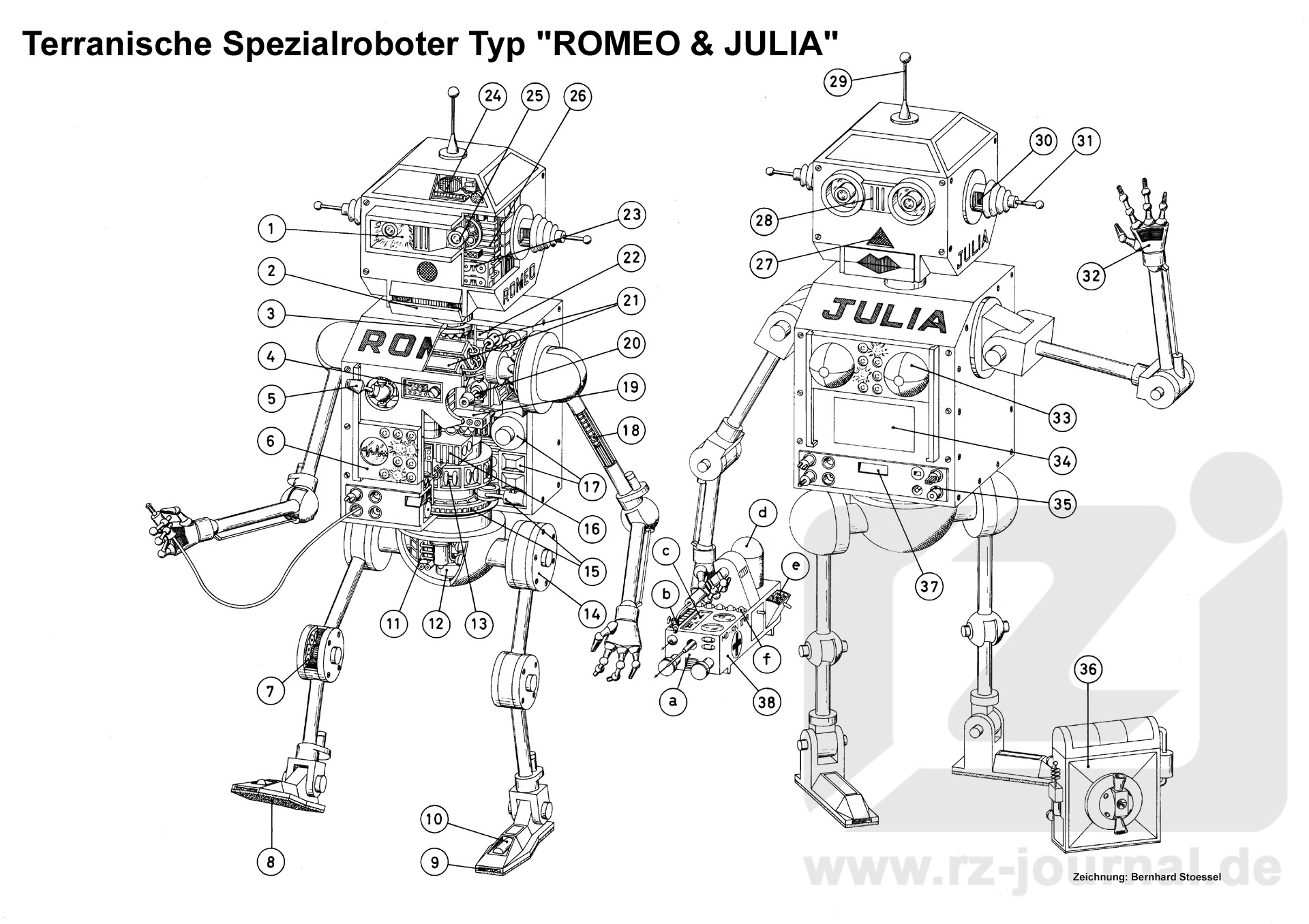 Allgemeines: Diese 2,5 m großen Roboter dienen als bewegliche Ableger der an Bord der SOL befindlichen Riesen-Biopositronik SENECA und sind durch Hyperfunk ständig mit ihr in Verbindung. Aus psychologischen Gründen hat man die beiden Roboter als klobige kastenartige Gebilde konstruiert mit vielen Besonderheiten wie leuchtenden Augen, Blinklampen, komischer Laufweise, beweglichem Mund mit ulkig klingender Stimme und humorvoller Redeweise. Diese Eigenarten dienen aber nur als Tarnung. In Wirklichkeit besitzen sie eine Hochleistungspositronik (ohne Bioplasma), Sensoren zur Erfassung allerdenkbaren optischen, akustischen oder energetischen Eindrücke. Außerdem haben R.u.J. eine ausgezeichnete Bewaffnung, bestehend aus zwei Multizweck- Energiestrahlern, die blitzartig aus den Kastenkörpern hervorschießen können. Zur Verteidigung besitzen sie widerstandsfähige Ynkelonium-Terkonit-Stahlkörper sowie schwere Paraton- und HÜ-Schutzschirme. Bei Bedarf können die beiden Roboter eine Geschwindigkeit und Geschicklichkeit entwickeln, die man ihnen nicht zutraut. Über Steckkabel können R.u.J. direkt an andere Positroniken angeschlossen werden und sind in der Lage, komplizierte wissenschaftliche und navigatorische Probleme zu lösen. Sie können sogar medizinische Operationen durchführen. |