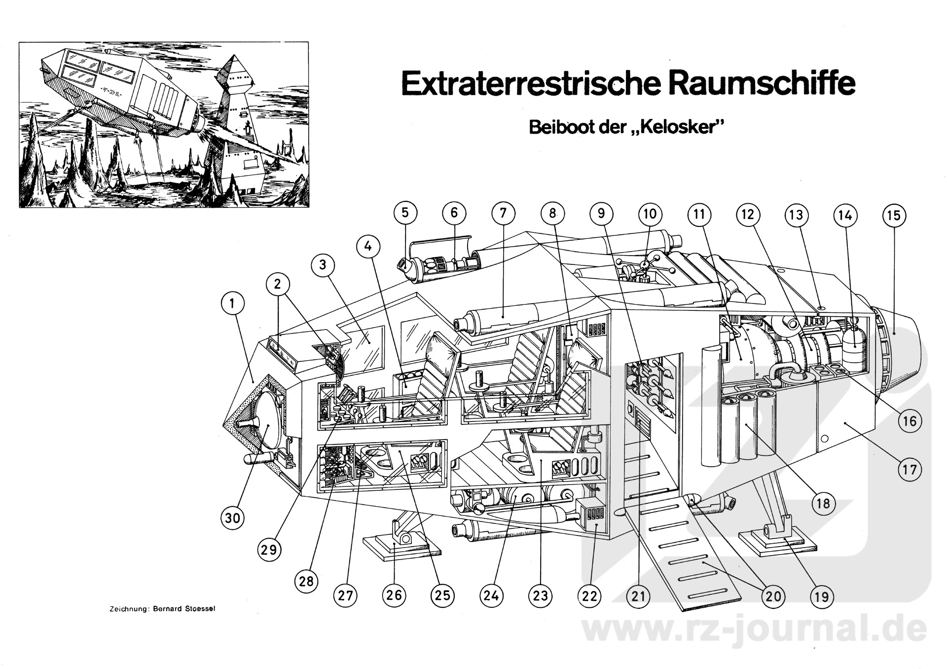 Allgemeines: Dieses kleine nur 12 m lange unbewaffnete Beiboot wird als Verbindungsboot zwischen Raumschiffen und Planeten verwendet. Da es keinen Überlichtantrieb hat und nur lichtschnell ist, wird es nur für kurze Flüge eingesetzt. Das Beiboot ist für 3 Kelosker ausgerüstet, kann aber im Notfall bis zu 8 Kelosker aufnehmen. |