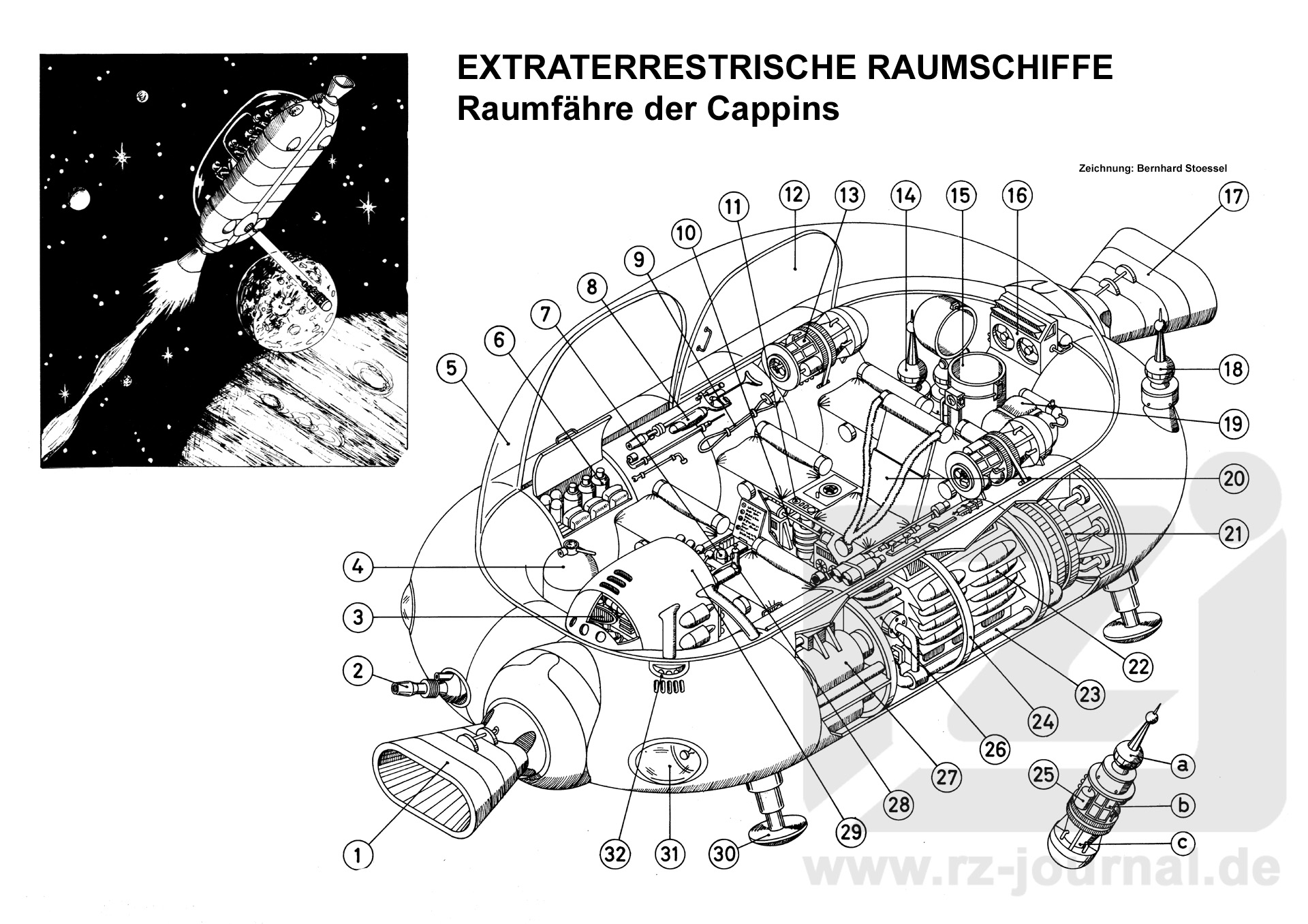 Allgemeines: Das Volk der Cappins aus der Sombrero-Galaxis NGC 4594 (auch Gruelfin genannt) verwendet dieses Kleinstbeiboot als Fähre für kurze Verbindungsflüge zwischen Raumschiffen oder Raumschiffen und Planeten. Bei Havarie kann es auch als Rettungsboot eingesetzt werden. Hierfür ist die Fähre mit einer Notausrüstung ausgestattet sowie mit drei Dakkarkom-Funkbojen, die man im Weltraum ausschleusen kann. Da die Fähre nur Antigrav- und Pulsator-Antriebe besitzt, kann sie nur bis knapp unter Lichtgeschwindigkeit beschleunigen. Treibstoff, Luft- und Notverpflegung der Fähre reichen aus, um eine 6-köpfige Besatzung für einen 60 Tage dauernden Flug zu versorgen. Die Fähre kann auch als Atmosphärengleiter verwendet werden. Technische Daten: Gesamtlänge 8 Meter; Länge ohne Pulsatorantrieb 6 Meter; Breite 2,5 Meter; Höhe 2,5 Meter; Besatzung: 1 bis 6 Personen. |