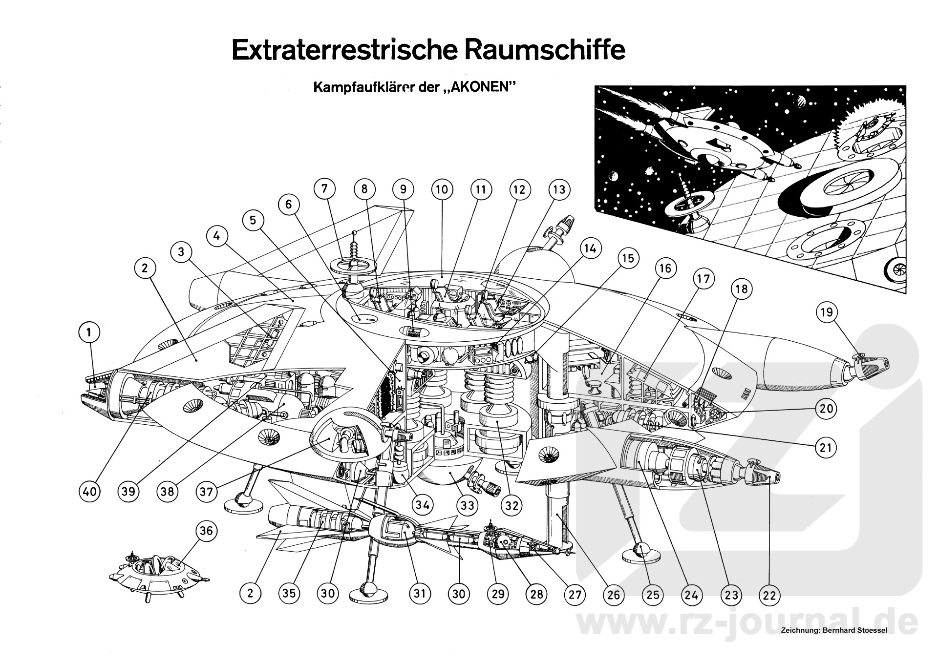 Allgemeines: Dieses schwerbewaffnete diskusförmige Beiboot wird (ähnlich der terranischen Space-Jets) als Fernaufklärer, Kommandotransporter und als Zerstörer gegen kleinere Raumschiffe verwendet. Der Rumpf hat einen Durchmesser von 30 m und eine Höhe über den abgeplatteten Polen (ohne Kommando- und Geschützkuppel) von 7 m. Das Beiboot besitzt 2 Aufhängestützen für Sonden oder Raumtorpedos. Außerdem besitzt es einen Hangar, der einen kleinen Atmosphärengleiter aufnehmen kann. Das Schiff hat eine Höchstbeschleunigung von 700 km/sec² und eine Reichweite von 50000 Lj. Die Normalbesatzung besteht aus 4 Mann; bei Fernflügen kann sie sich auf 10 Mann erhöhen. |
